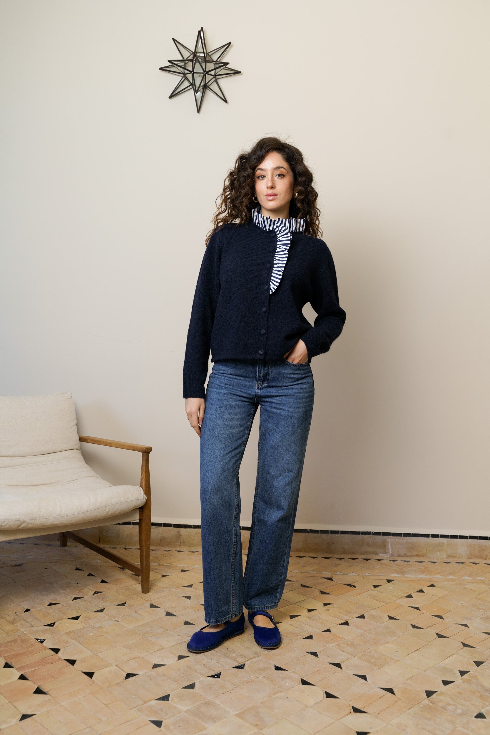 This soft knit cardigan features an integrated striped shirt collar. This structured detail creates the effect of layering without adding bulk. A practical and elegant piece for everyday wear.