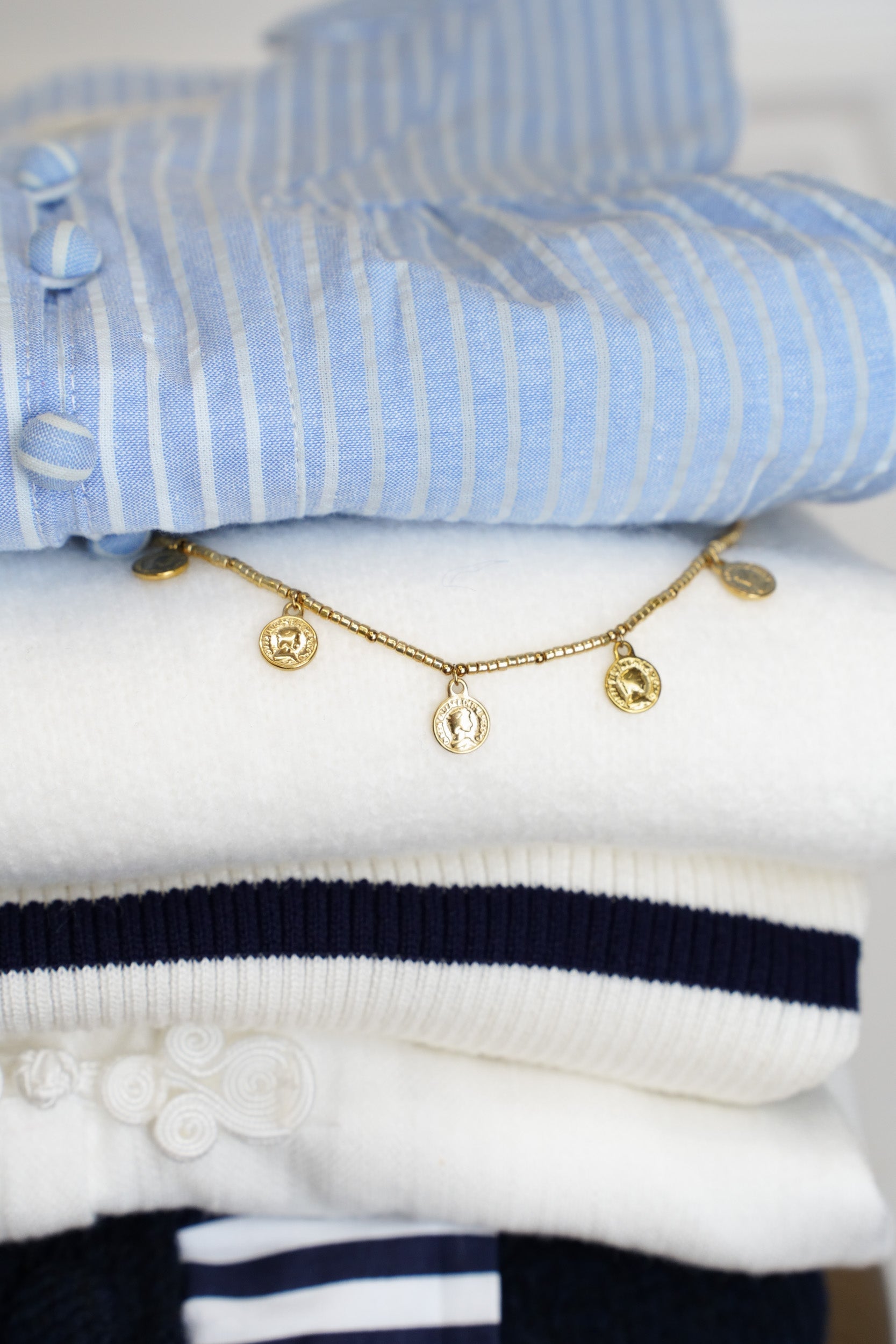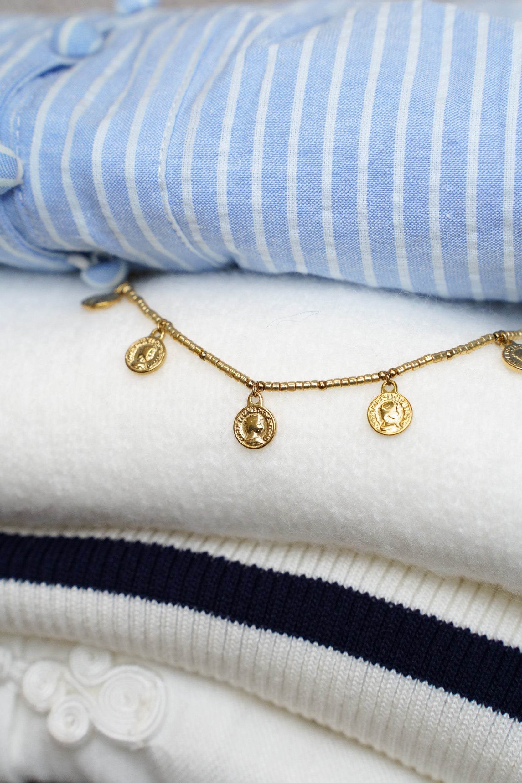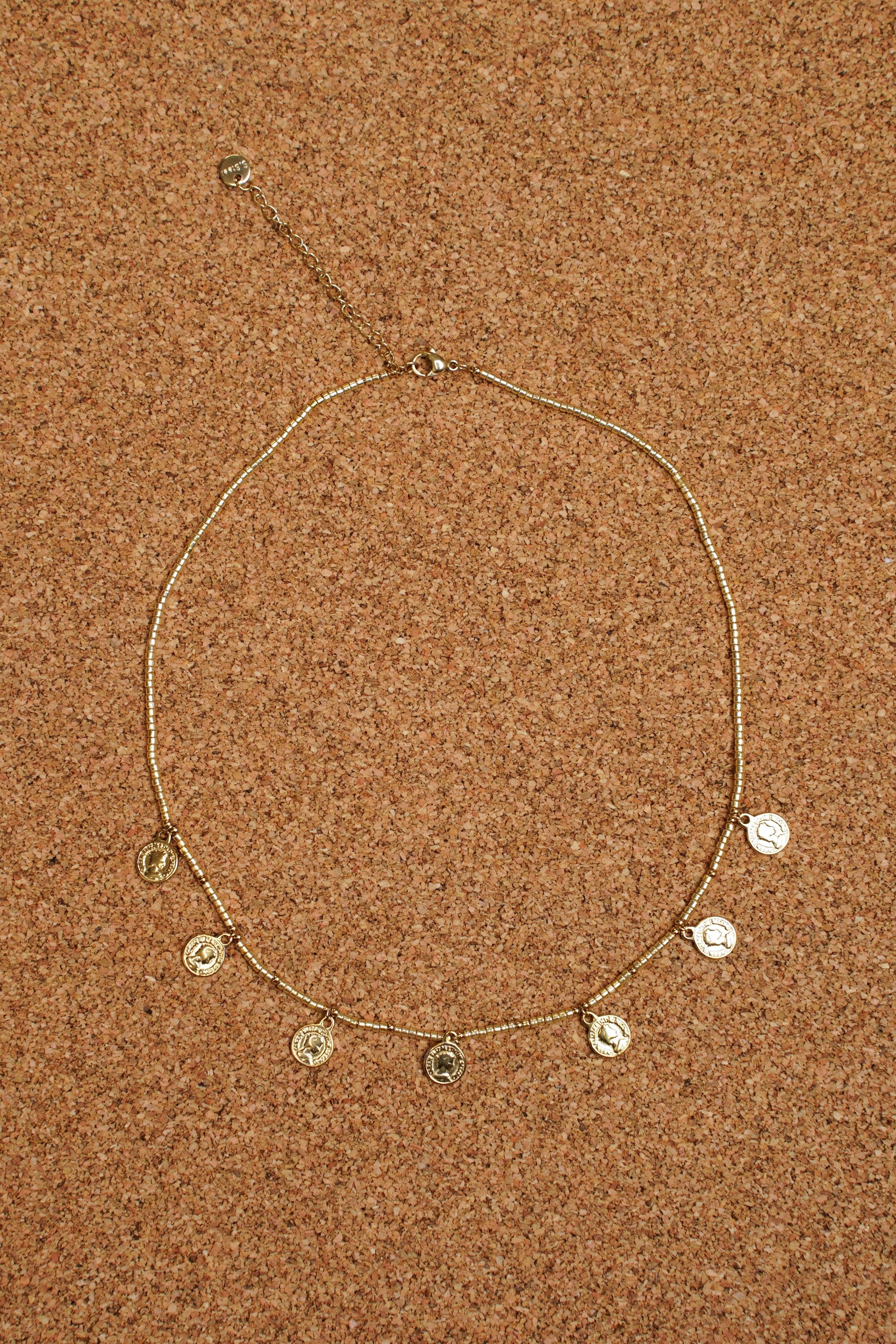 A delicate necklace composed of a gold chain adorned with small medal-like pendants distributed across the front. The round pendants feature a raised design inspired by antique coins.