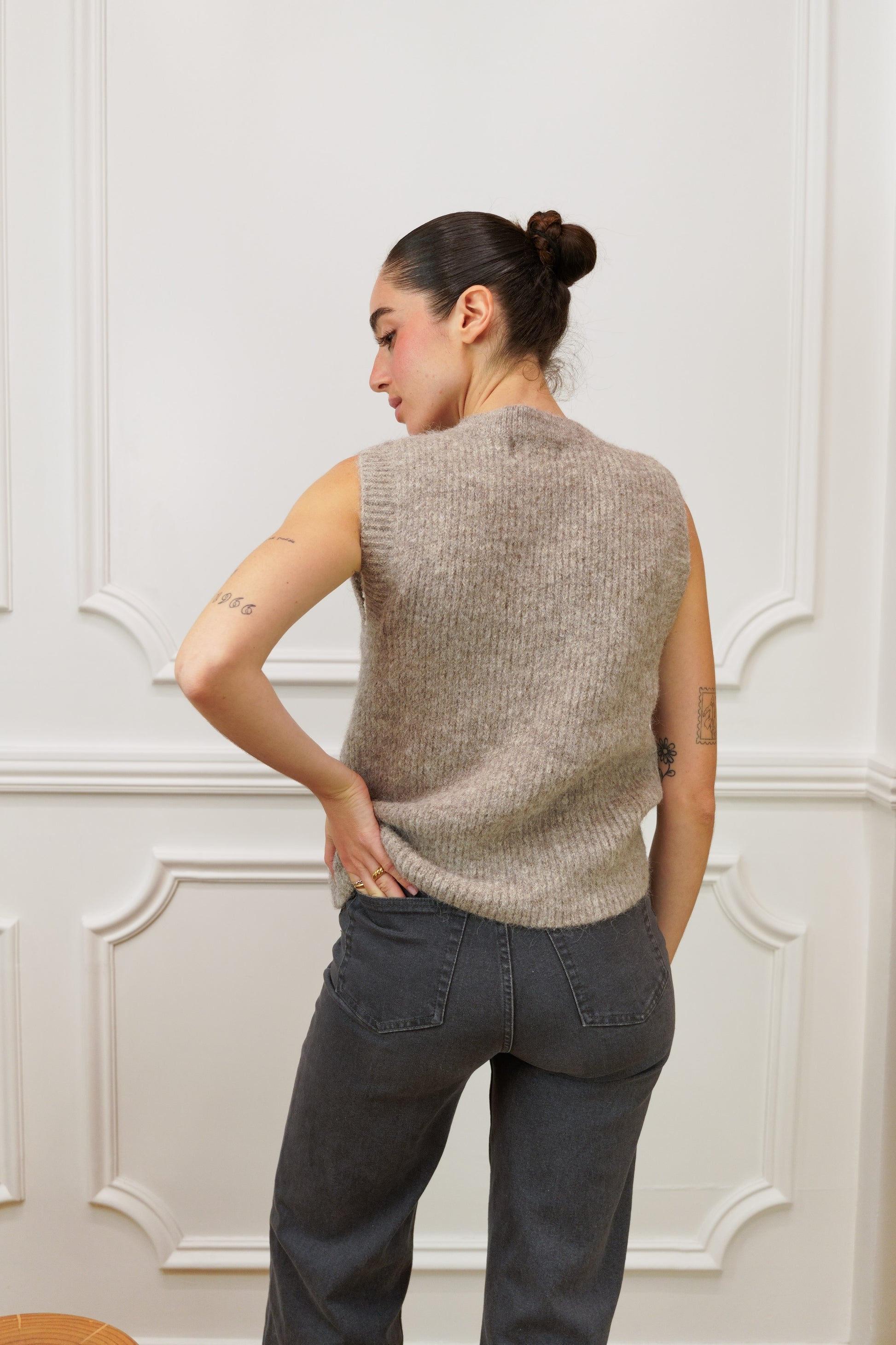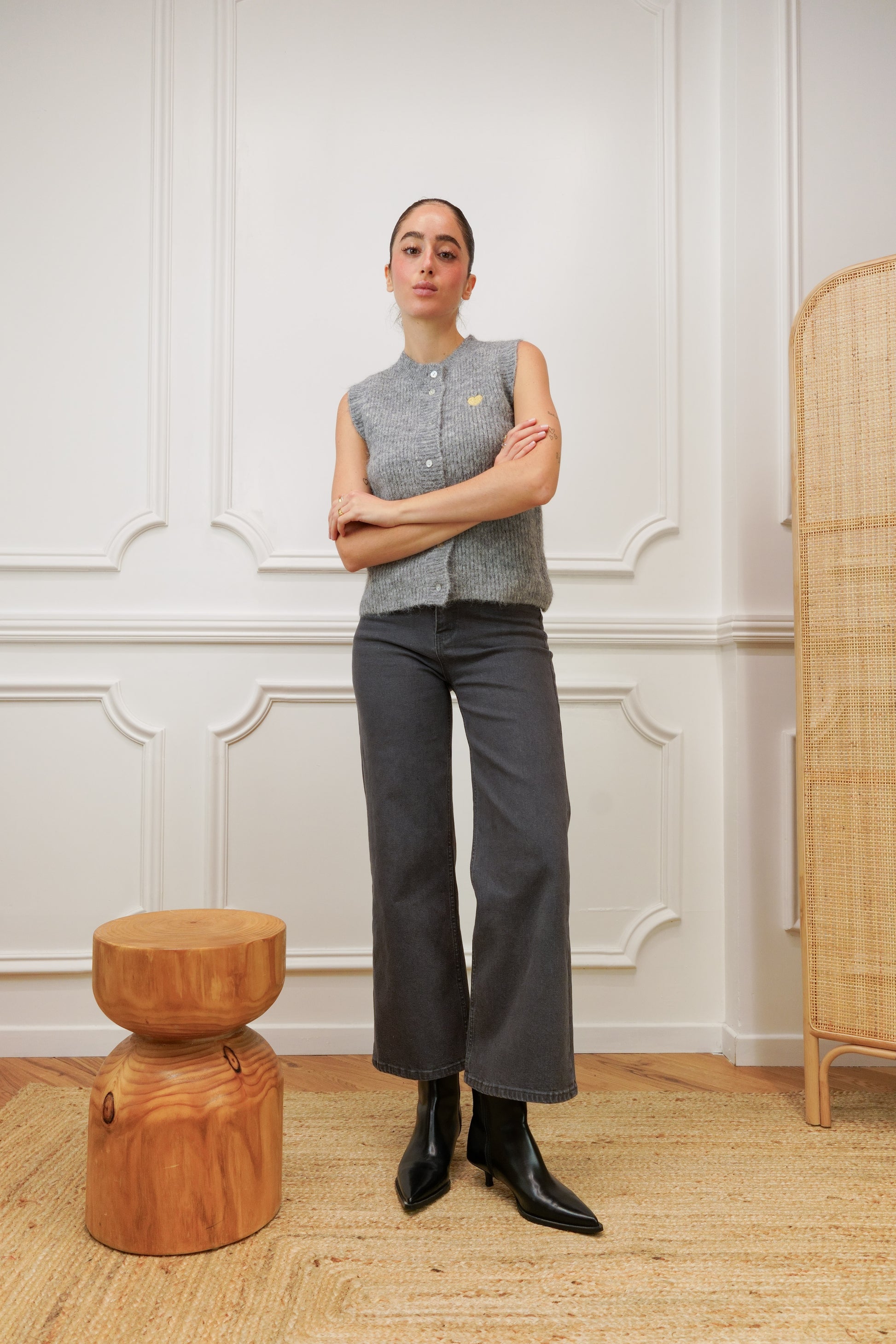 With its sleeveless cut, discreet buttons and golden heart embroidery, Orane slips easily over a white shirt, a basic t-shirt or directly against the skin.
