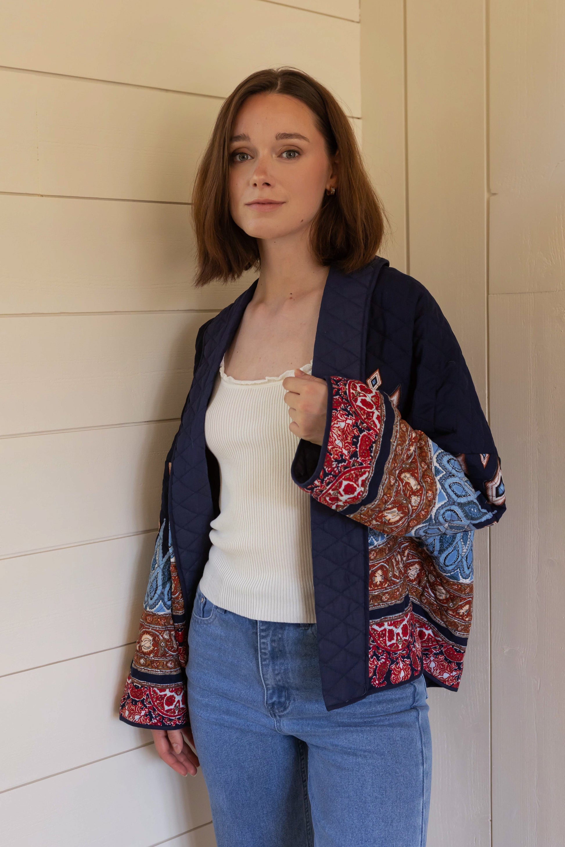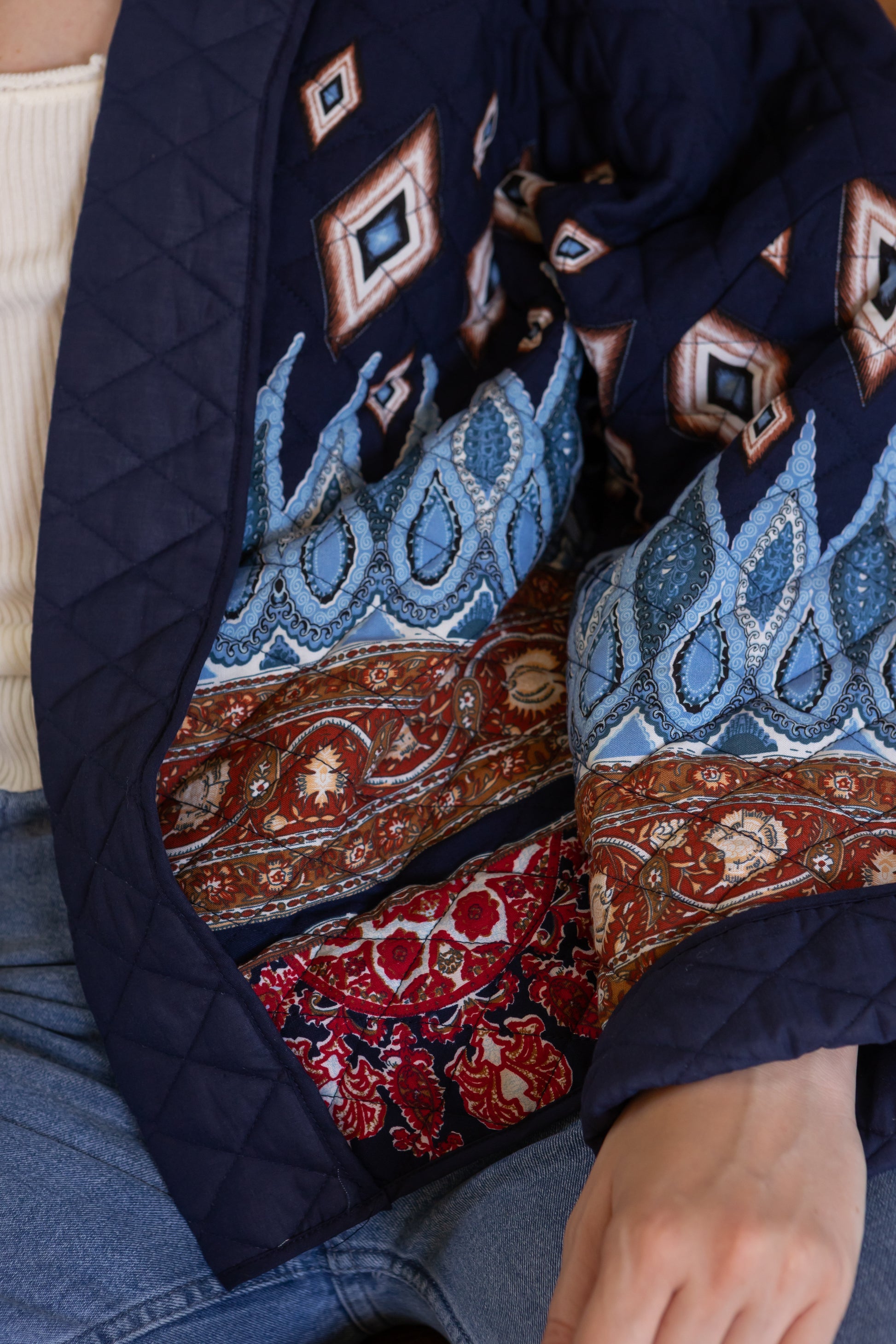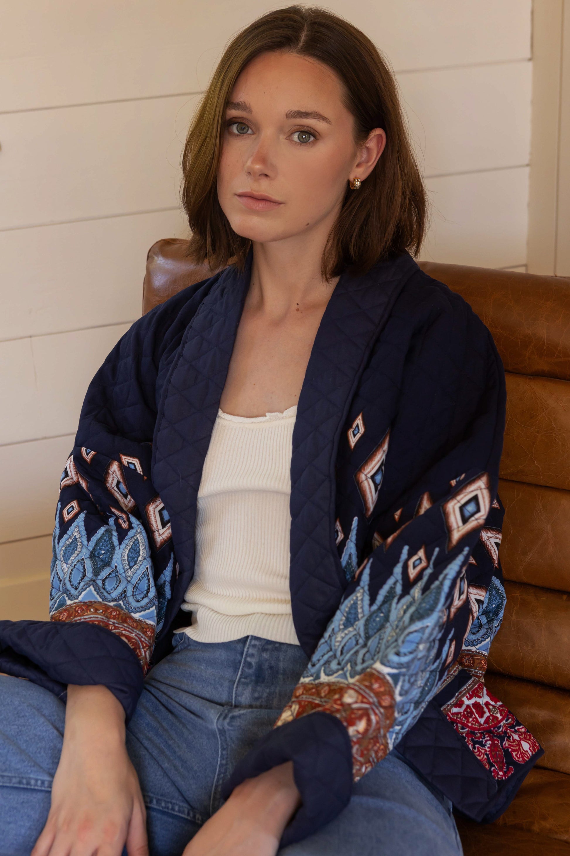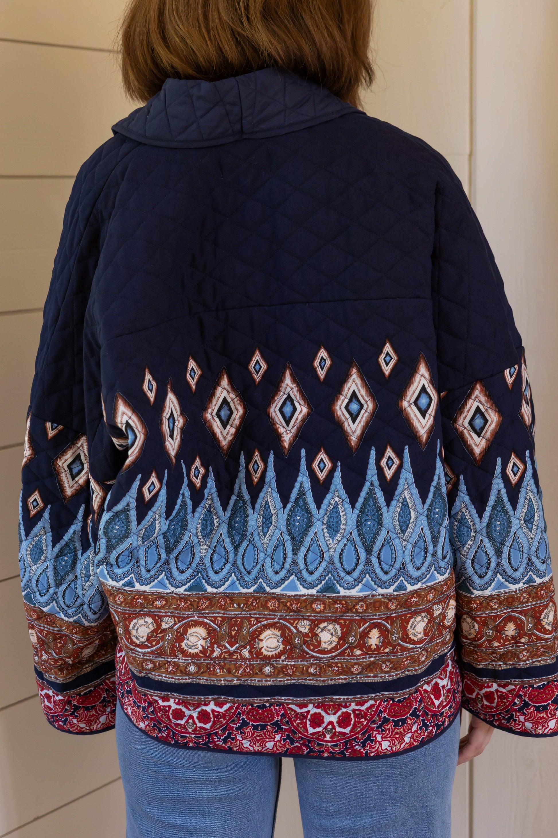 Viviane is the coat for fall getaways. Its wide sleeves, comfortable quilting, and hypnotic print make it the season's statement piece. Wear with brut denim.
