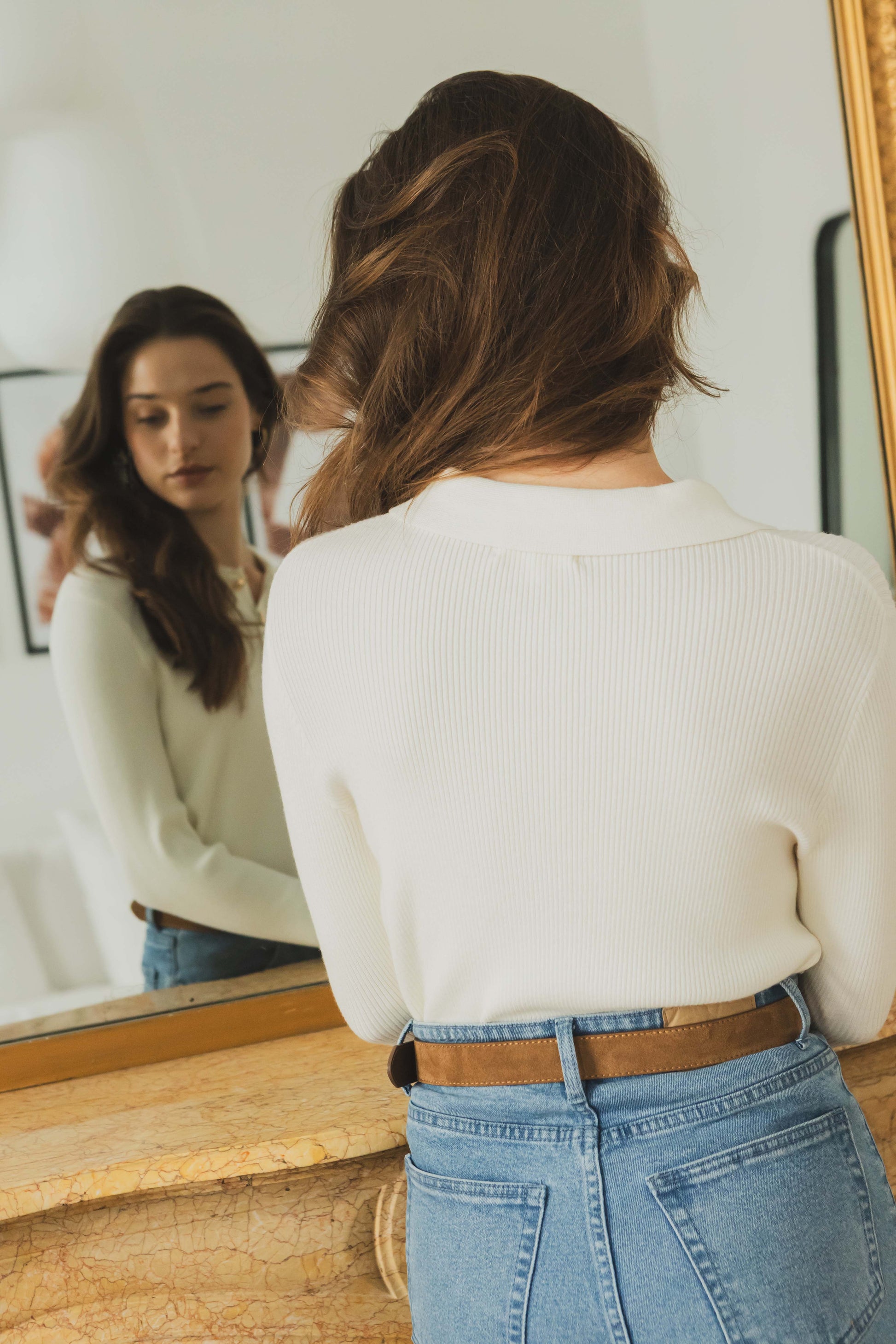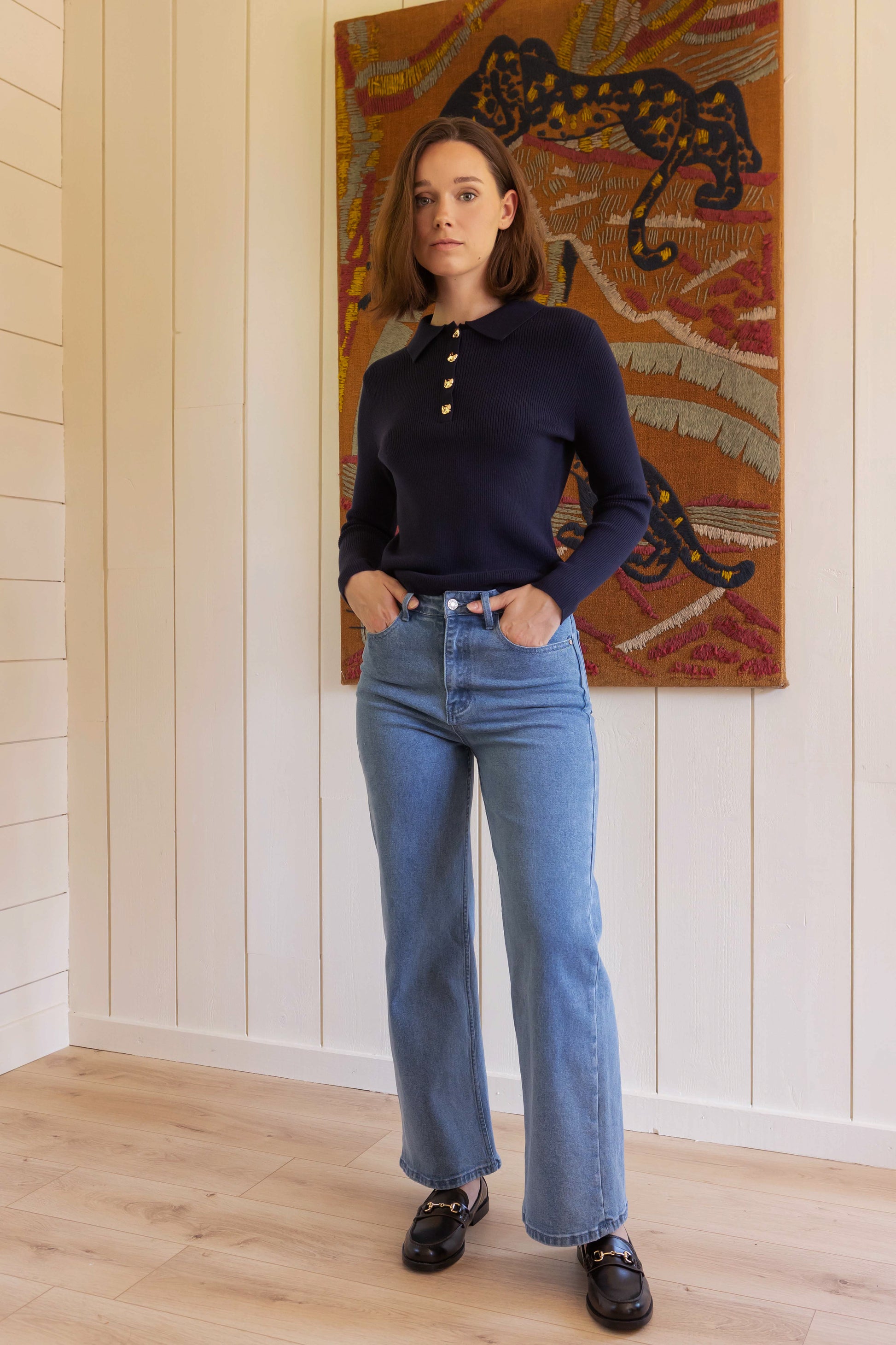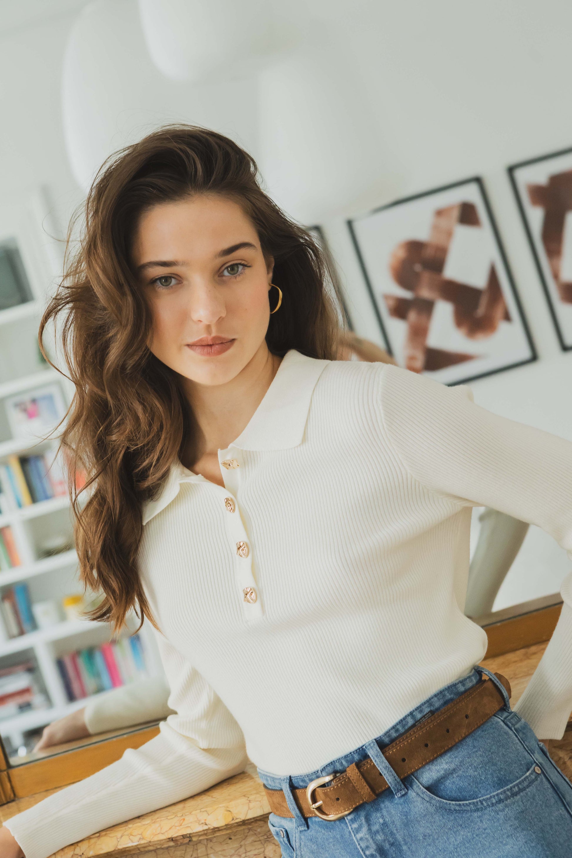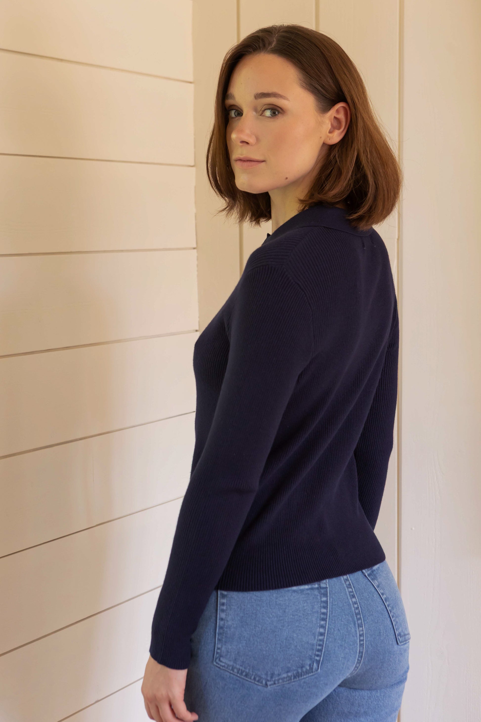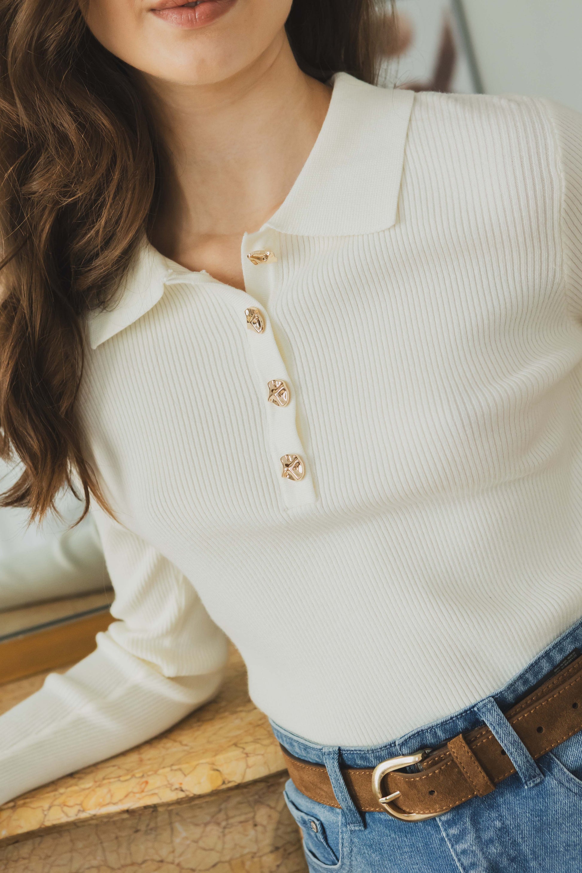 Mahault is the perfect sweater for slightly cooler days. Its shirt collar and pretty gold buttons add an elegant touch to this soft, close-fitting knit. Wear it at the office or on the weekend with raw jeans or a midi skirt.