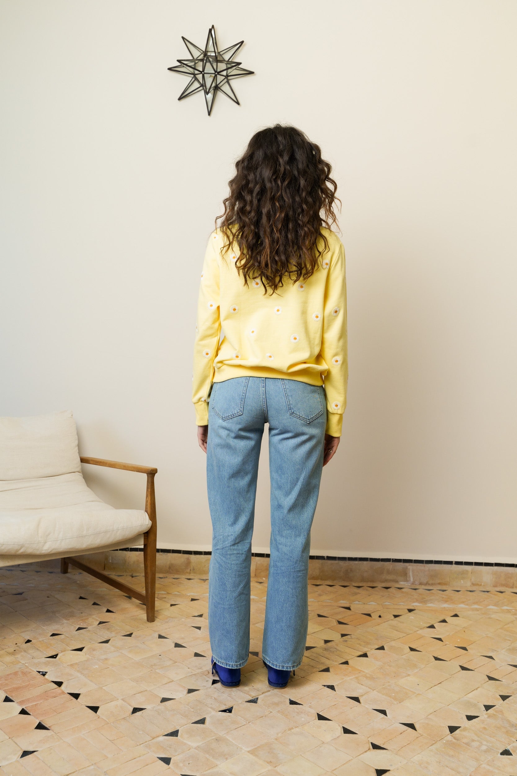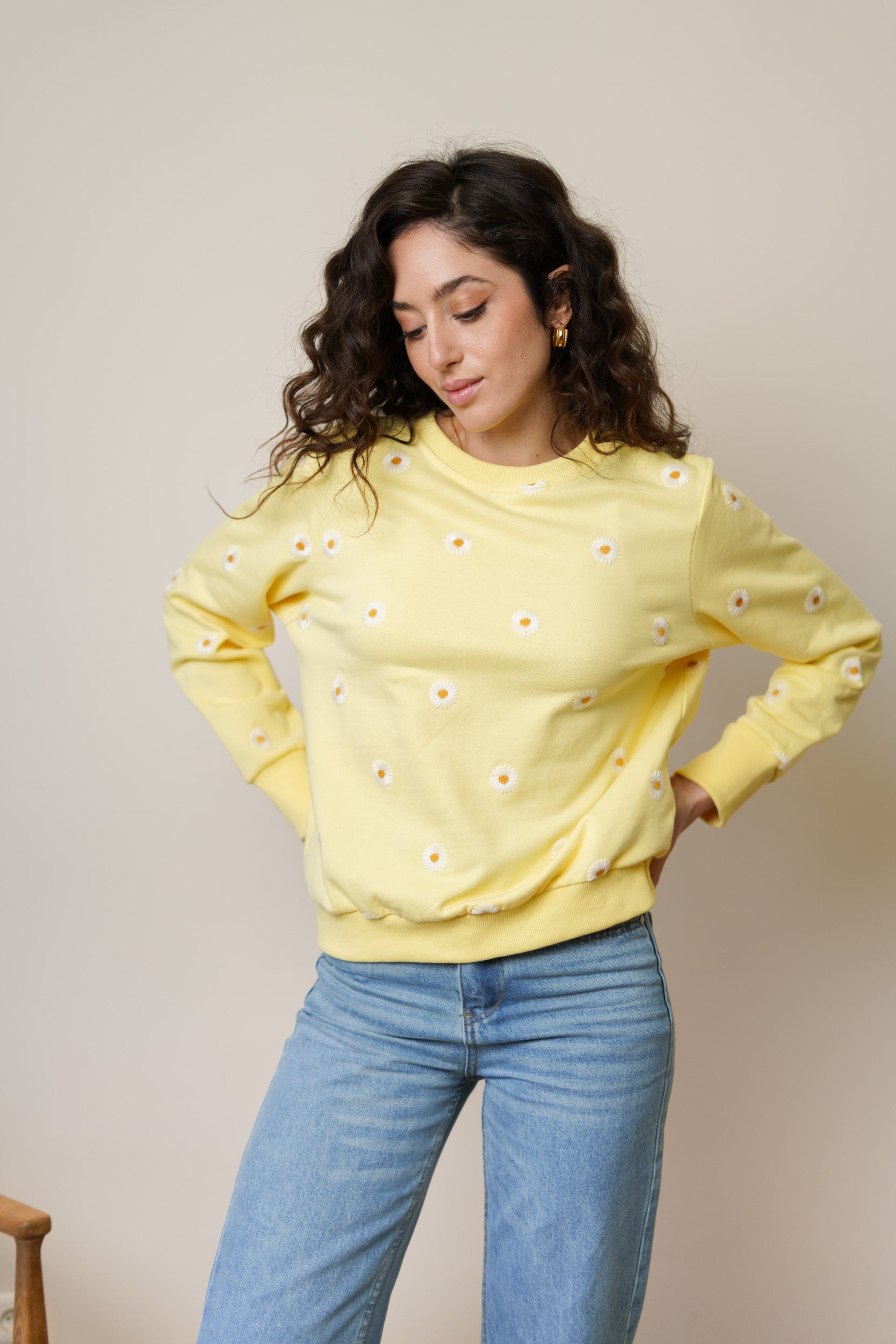 Sweatshirt adorned with delicate embroidered daisies. An ideal choice to brighten your days with style and comfort, as soon as the warmer weather arrives.