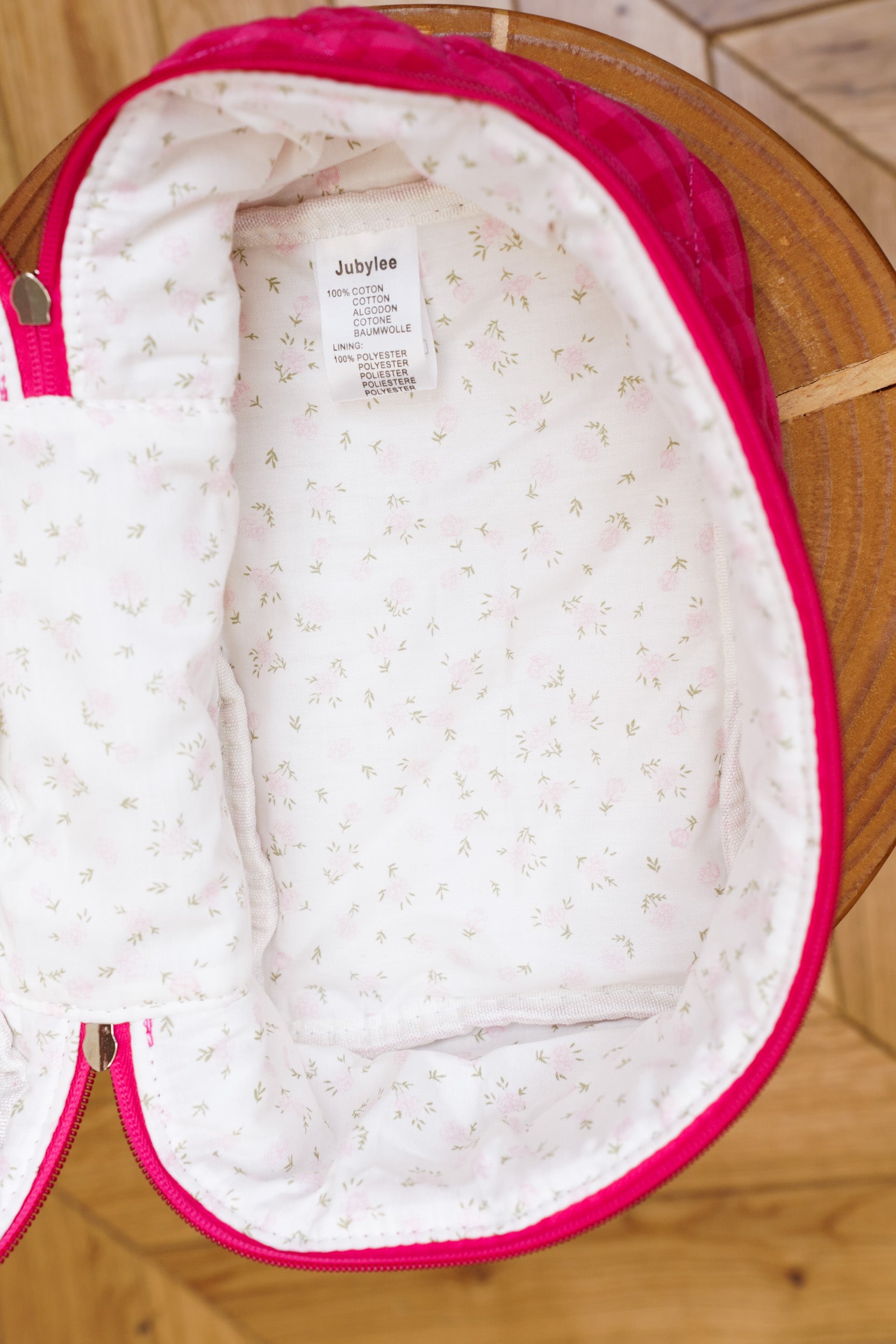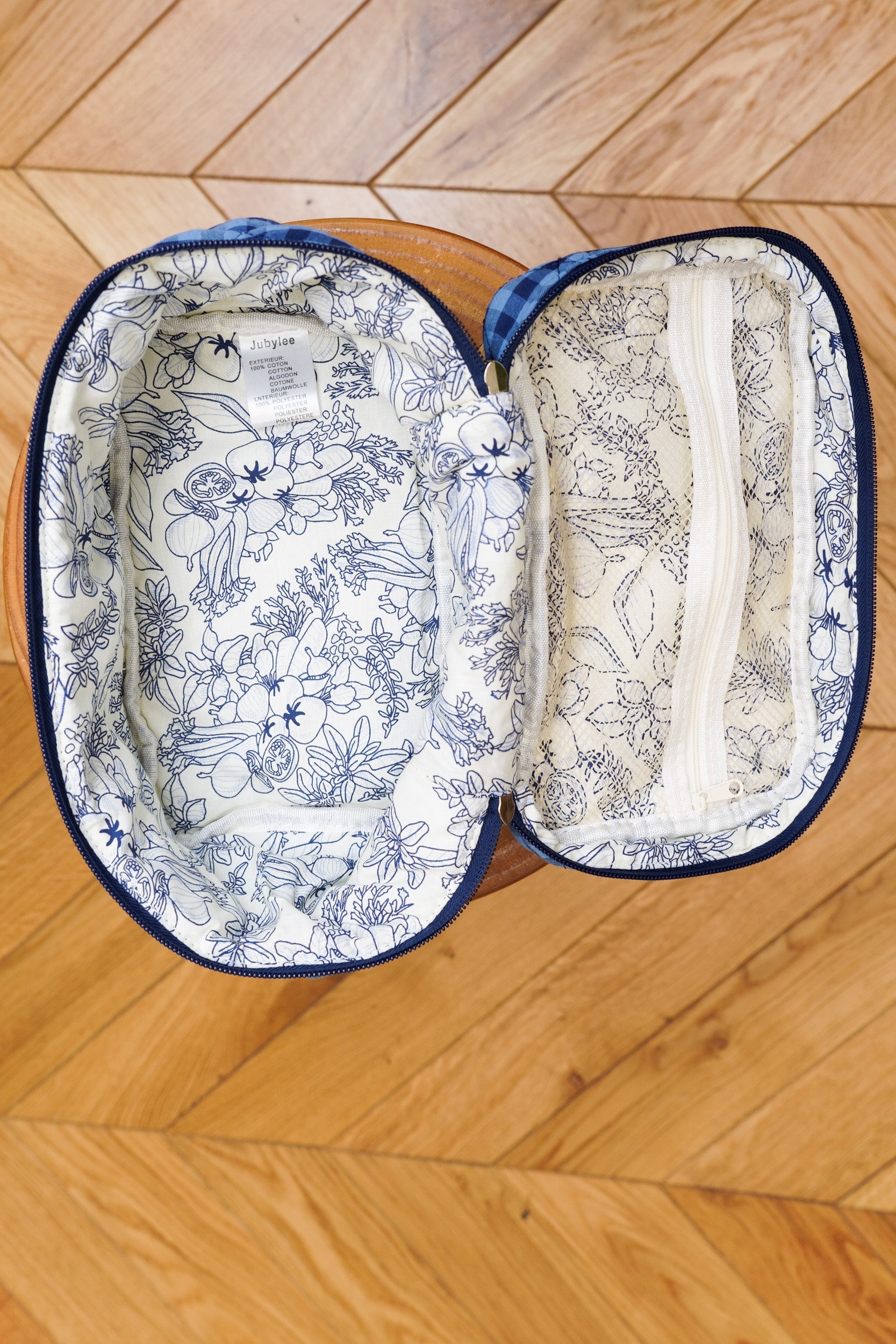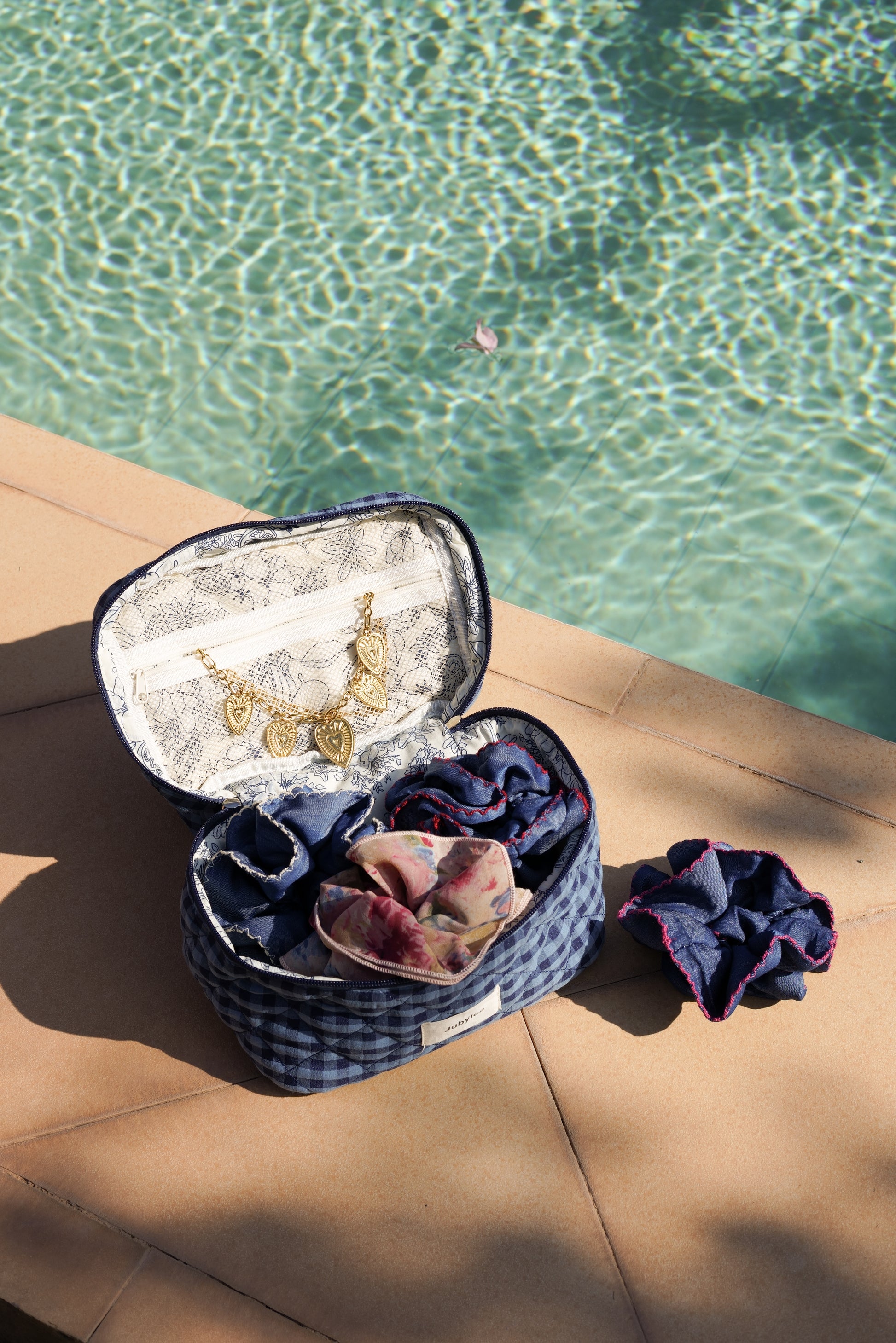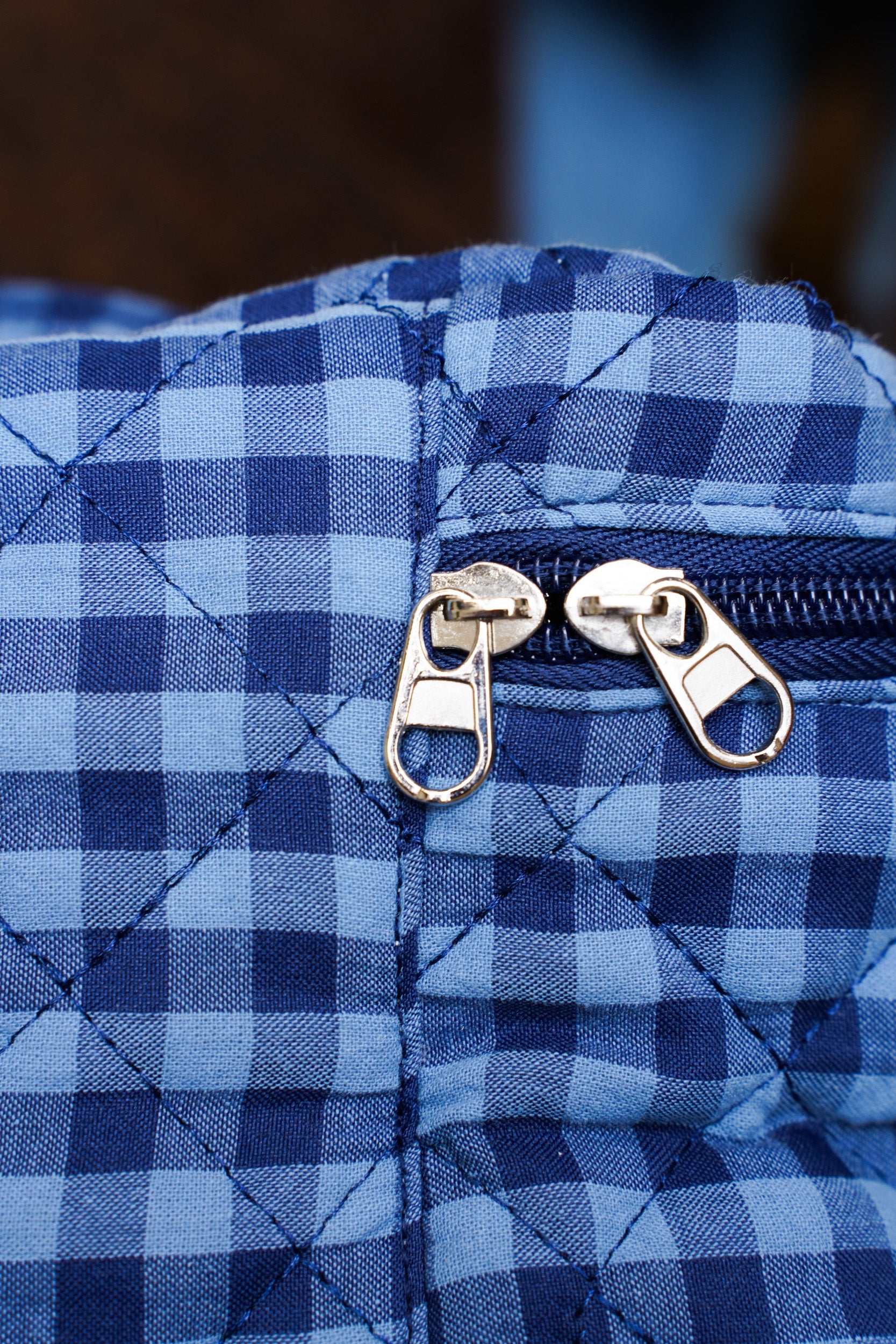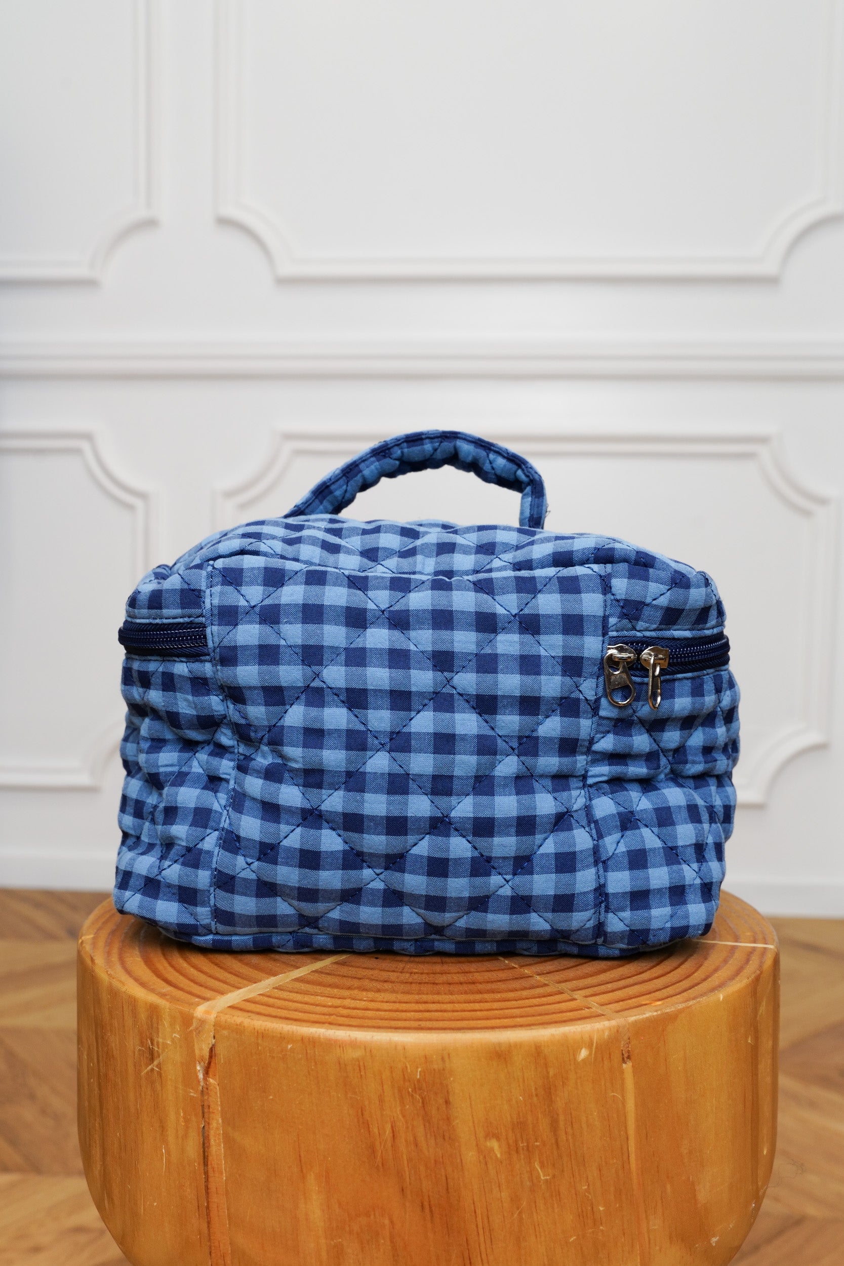 This gingham vanity case is ideal for storing your beauty and travel essentials. Its quilted design provides structure while maintaining a soft feel. Its compact size makes it easy to slip into a suitcase or weekend bag. The interior is fully lined with cotton fabric. It includes a spacious main compartment as well as a zippered pocket for organizing makeup, accessories, or skincare products.