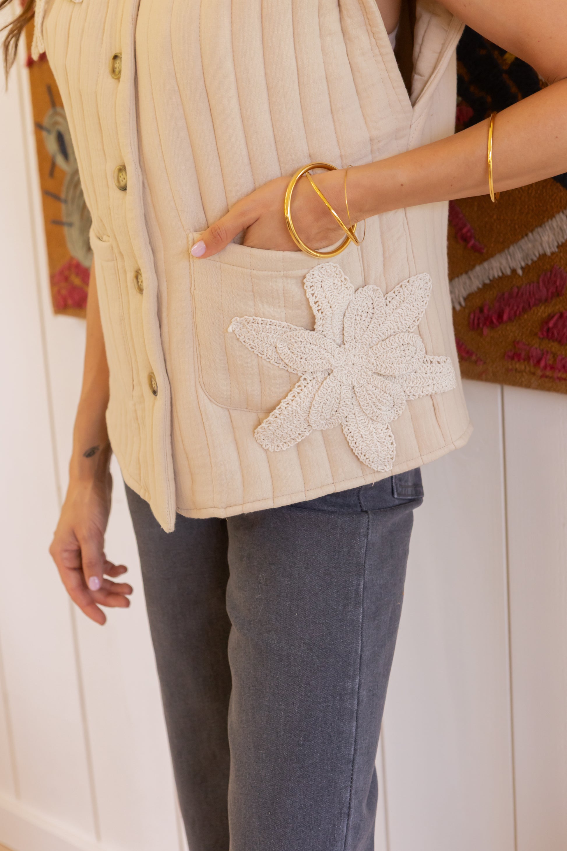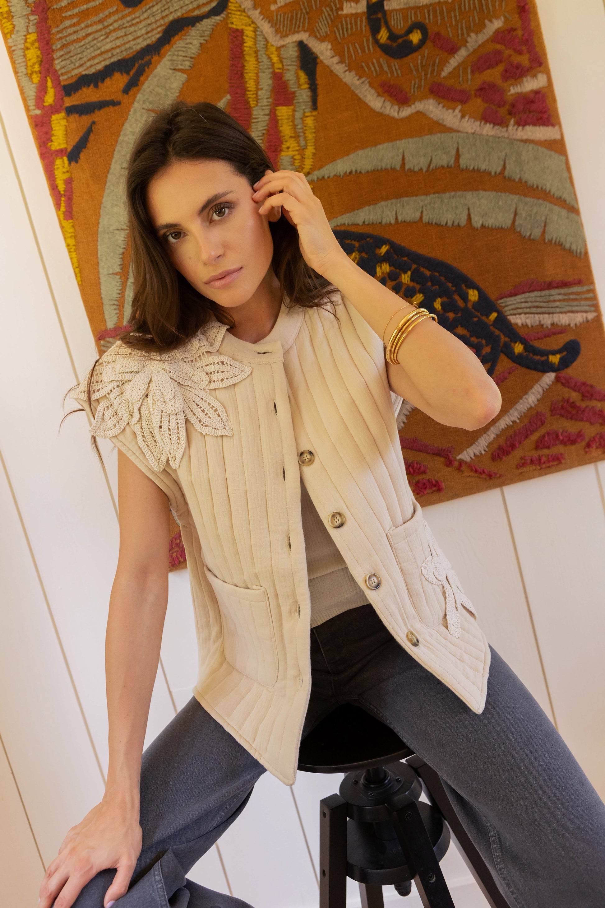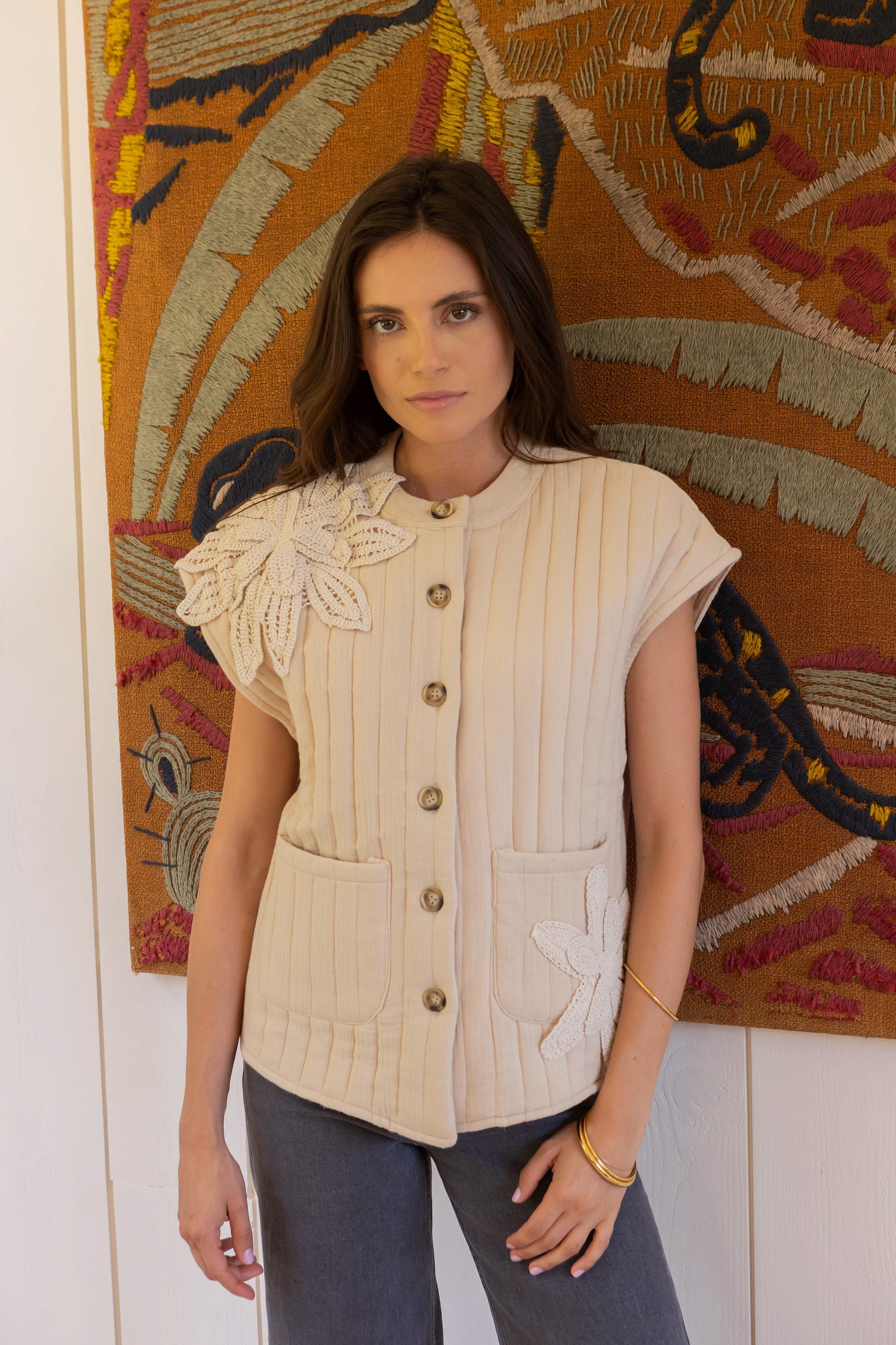 Constance jacket is bold with its sleeveless design and crocheted florals. It's the perfect piece for layering looks and adding a touch of character. Pair it with jeans, a long skirt, or loose-fitting pants for a bold style.