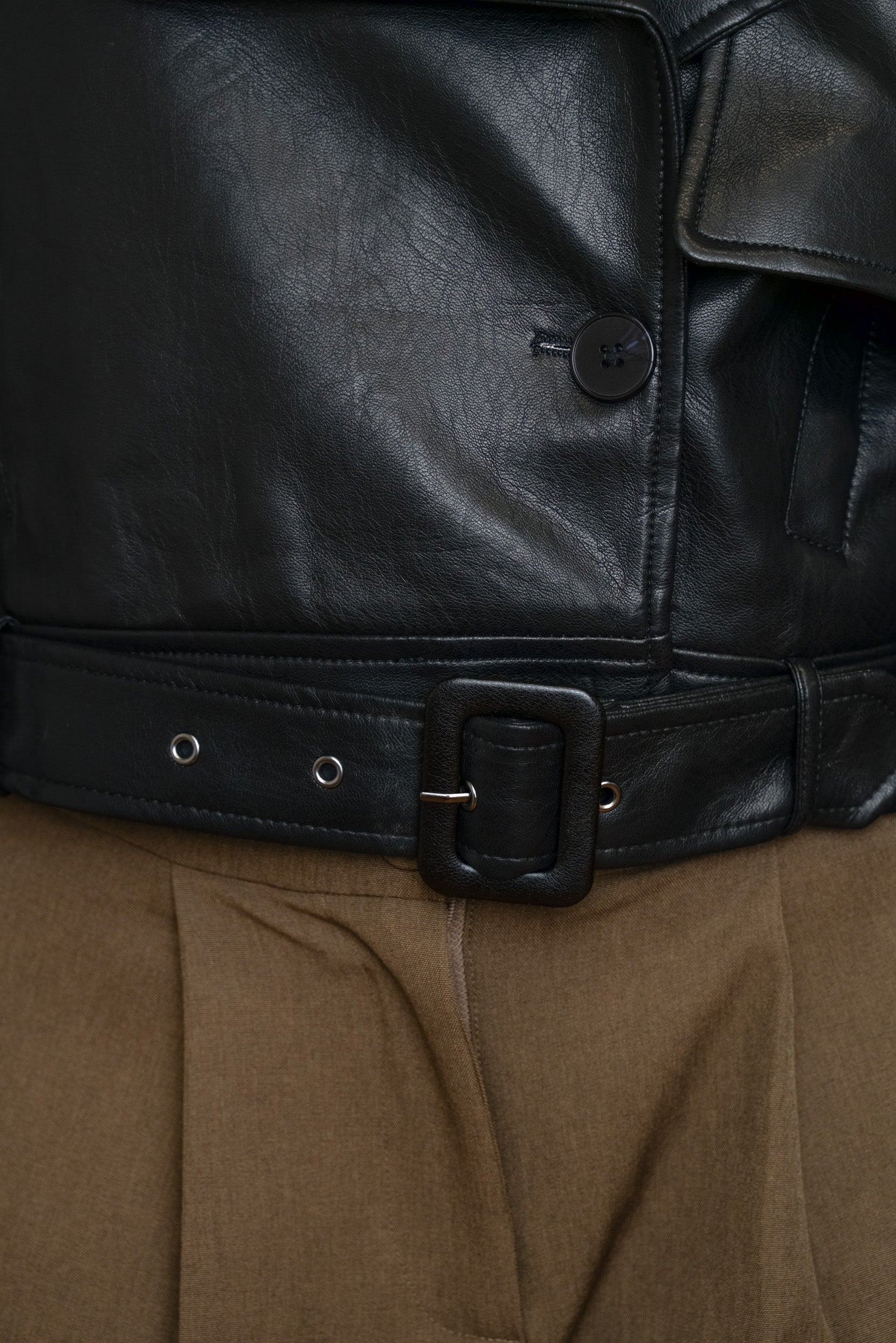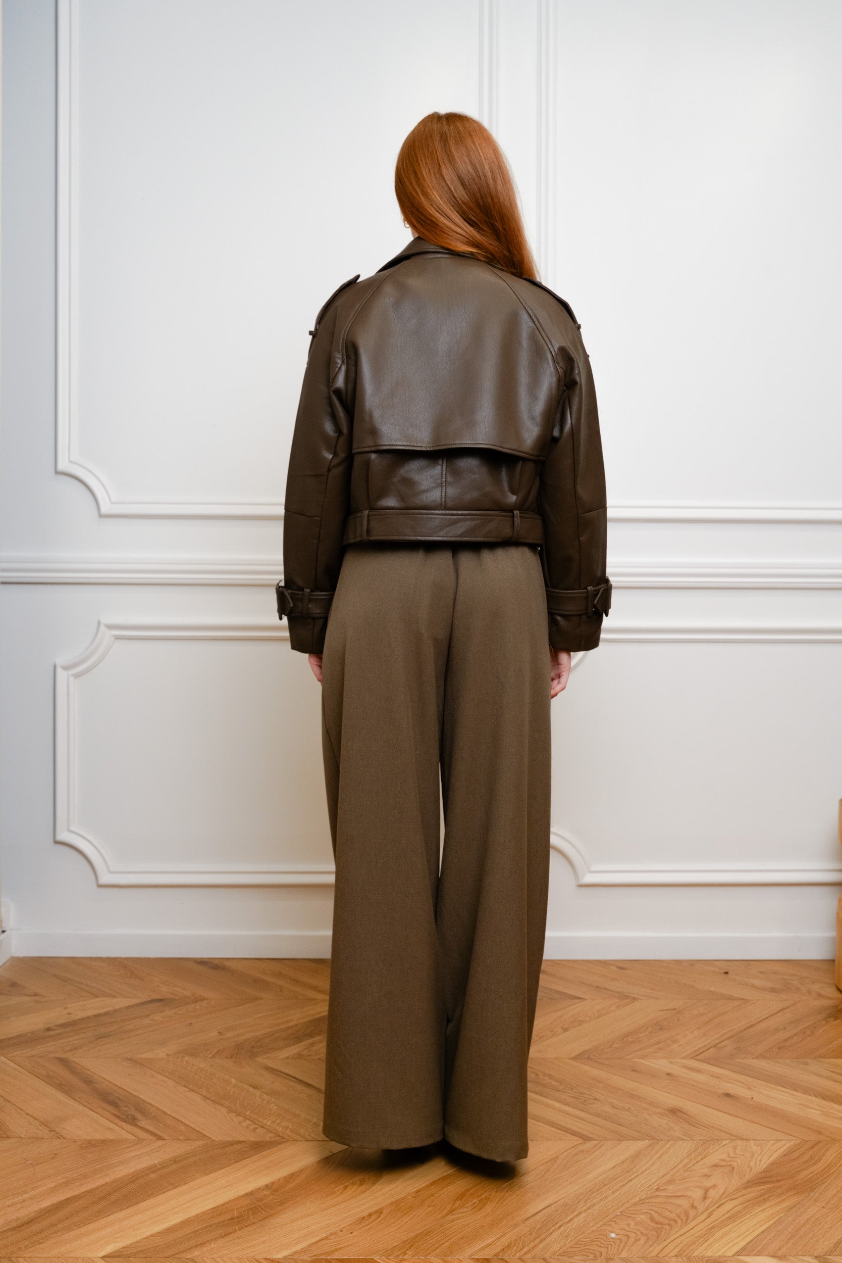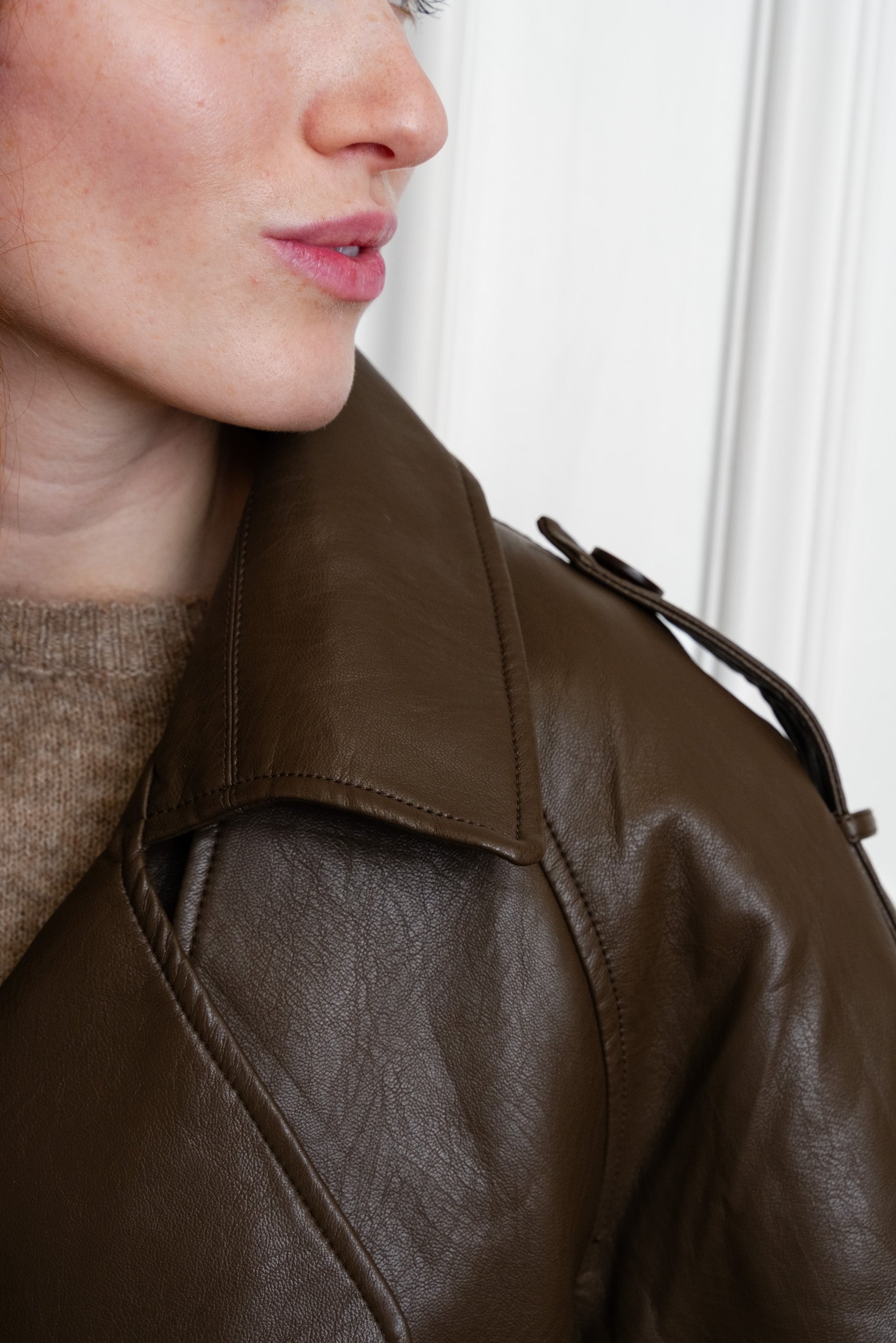 The Vicky jacket reinterprets the traditional trench coat in a short and bold version. Crafted from faux leather, this statement piece instantly structures your silhouette thanks to its double-breasted cut and refined details. Blending vintage charm with urban modernity, it's the ideal jacket for those seeking a key piece for their mid-season wardrobe.