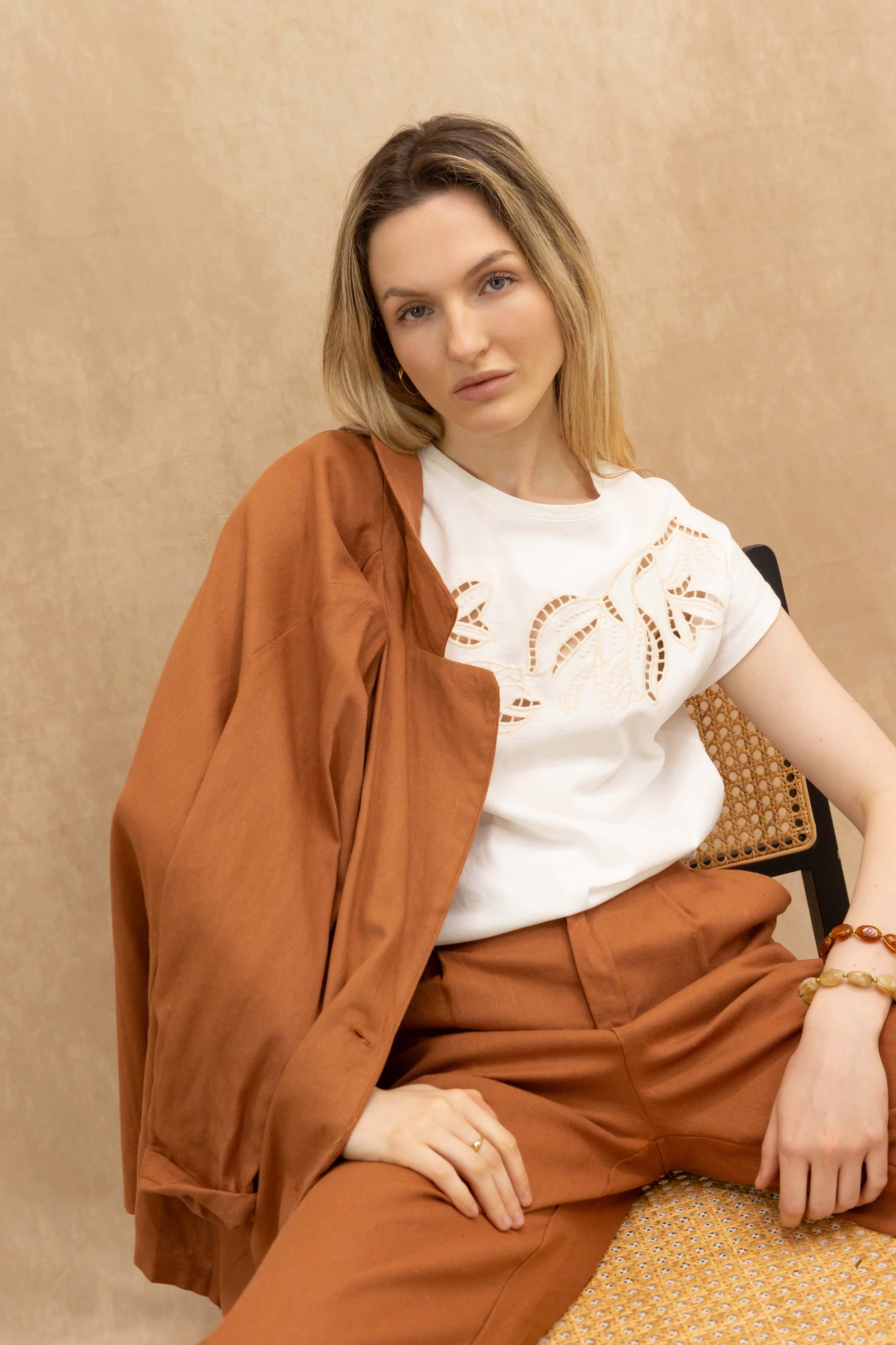 A lightweight, straight-cut jacket designed for sunny days. Made from a linen blend in a warm terracotta hue, it’s a refined and easy-to-wear piece. Wear it as a full look with the matching pants.