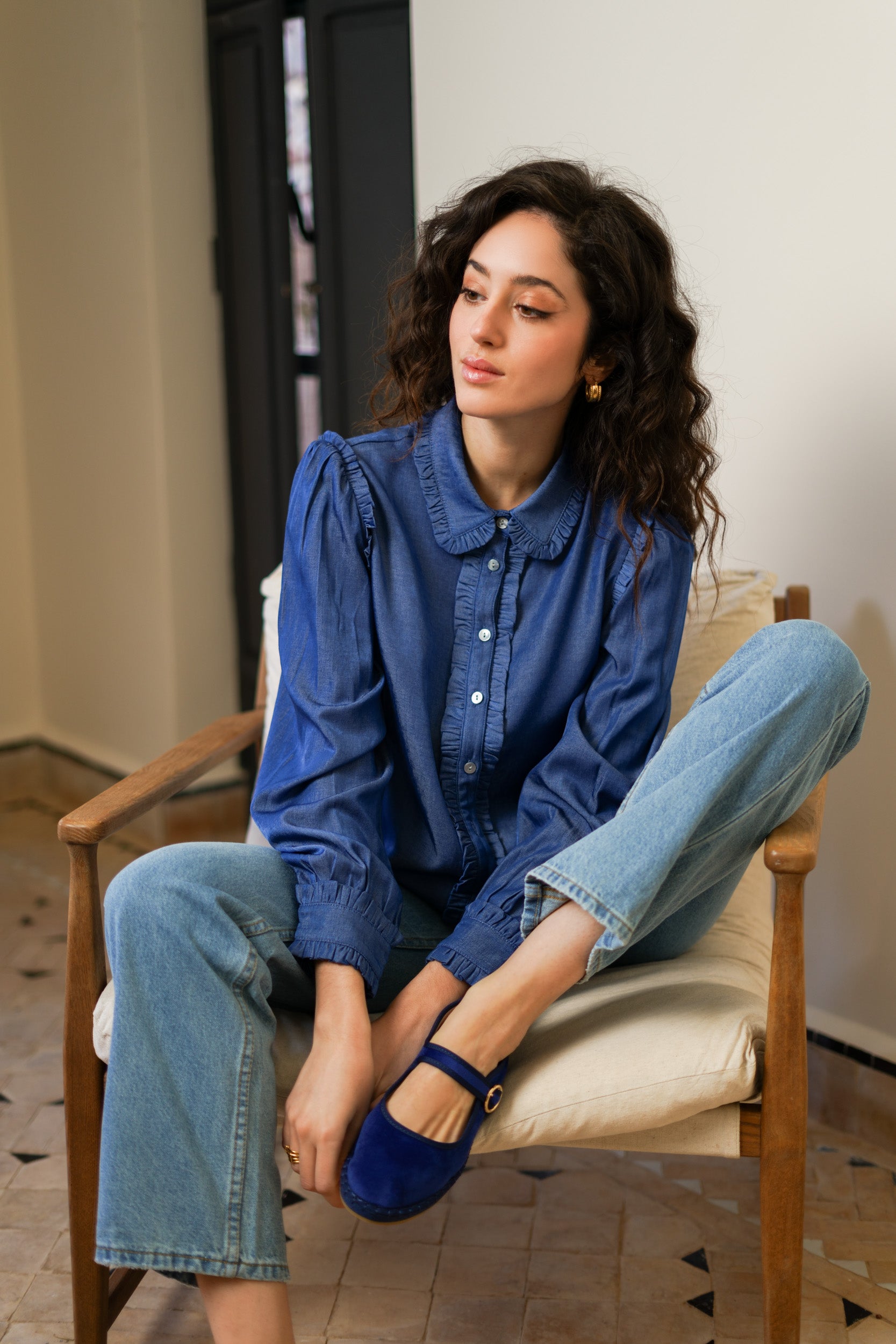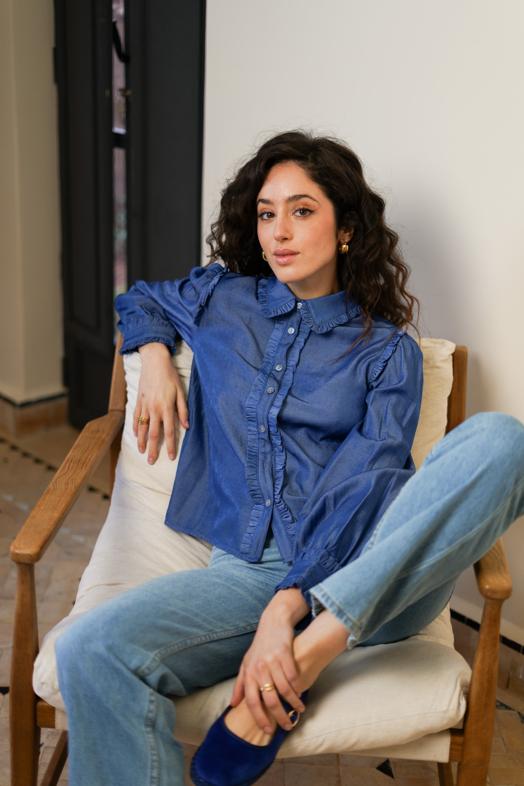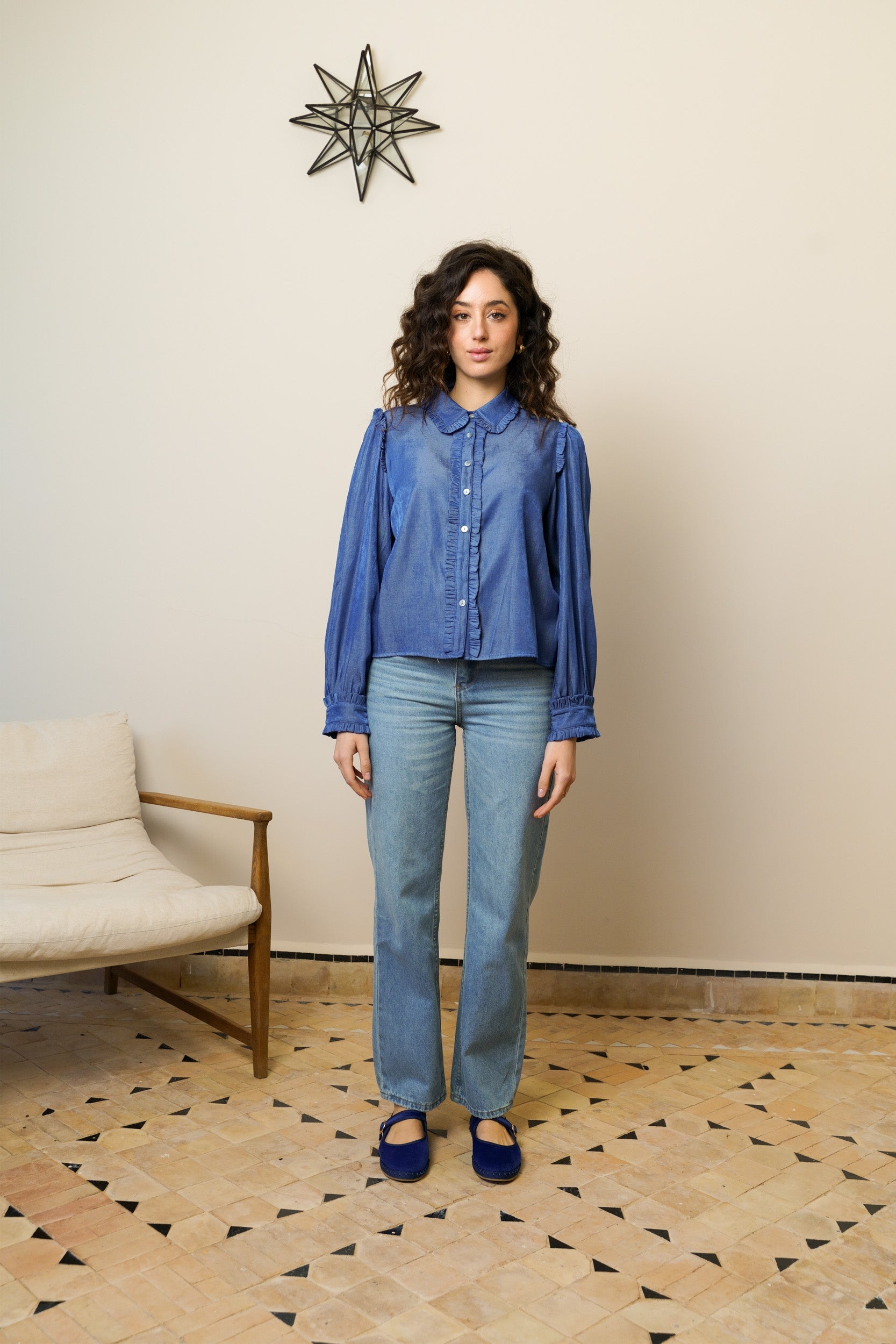 La blouse Fanny adopte une coupe droite légèrement ample offrant aisance et confort au porter. Le col Claudine est structuré par un volant appliqué en pourtour. La patte de boutonnage centrale est mise en valeur par un empiècement volanté sur toute la longueur. Les épaules sont subtilement froncées afin d’apporter du volume et de structurer la ligne de manche.