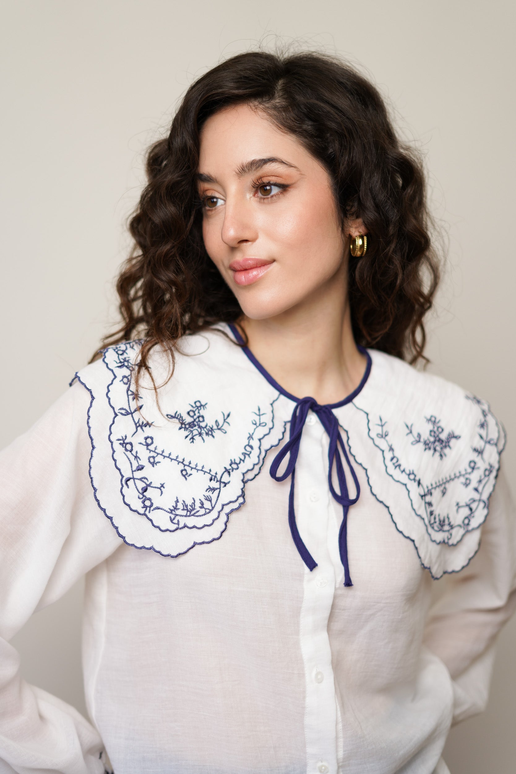 Réalisée dans une matière légère et transparente, la blouse Jade présente une coupe droite. Le tissu est fin et souple. Les manches sont longues et légèrement amples. Les poignets sont resserrés et décorés d’un rappel de broderie.