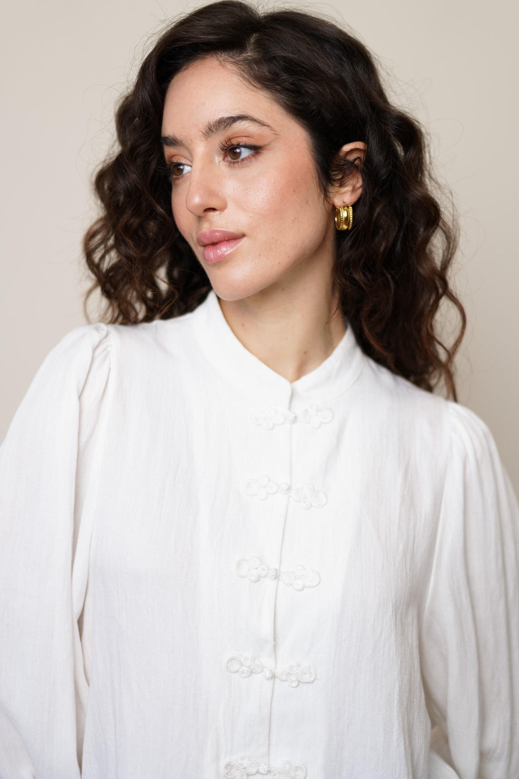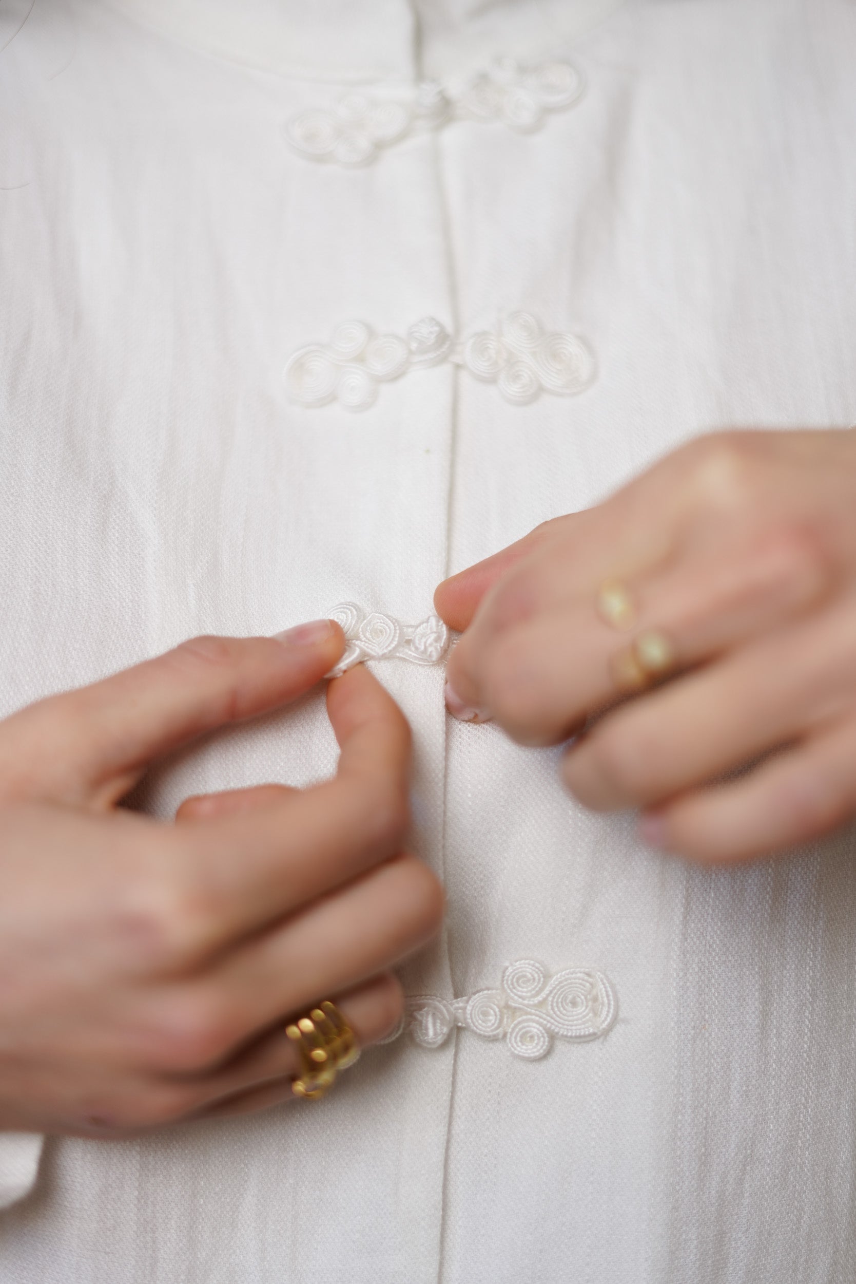 Le tissu est souple et accompagne les mouvements sans rigidité. Le col est montant et épuré. La fermeture se fait par des attaches décoratives type brandebourgs placées sur le devant.