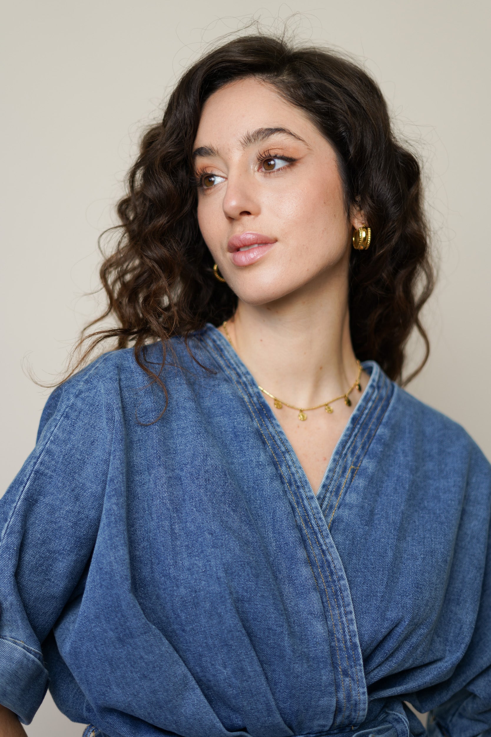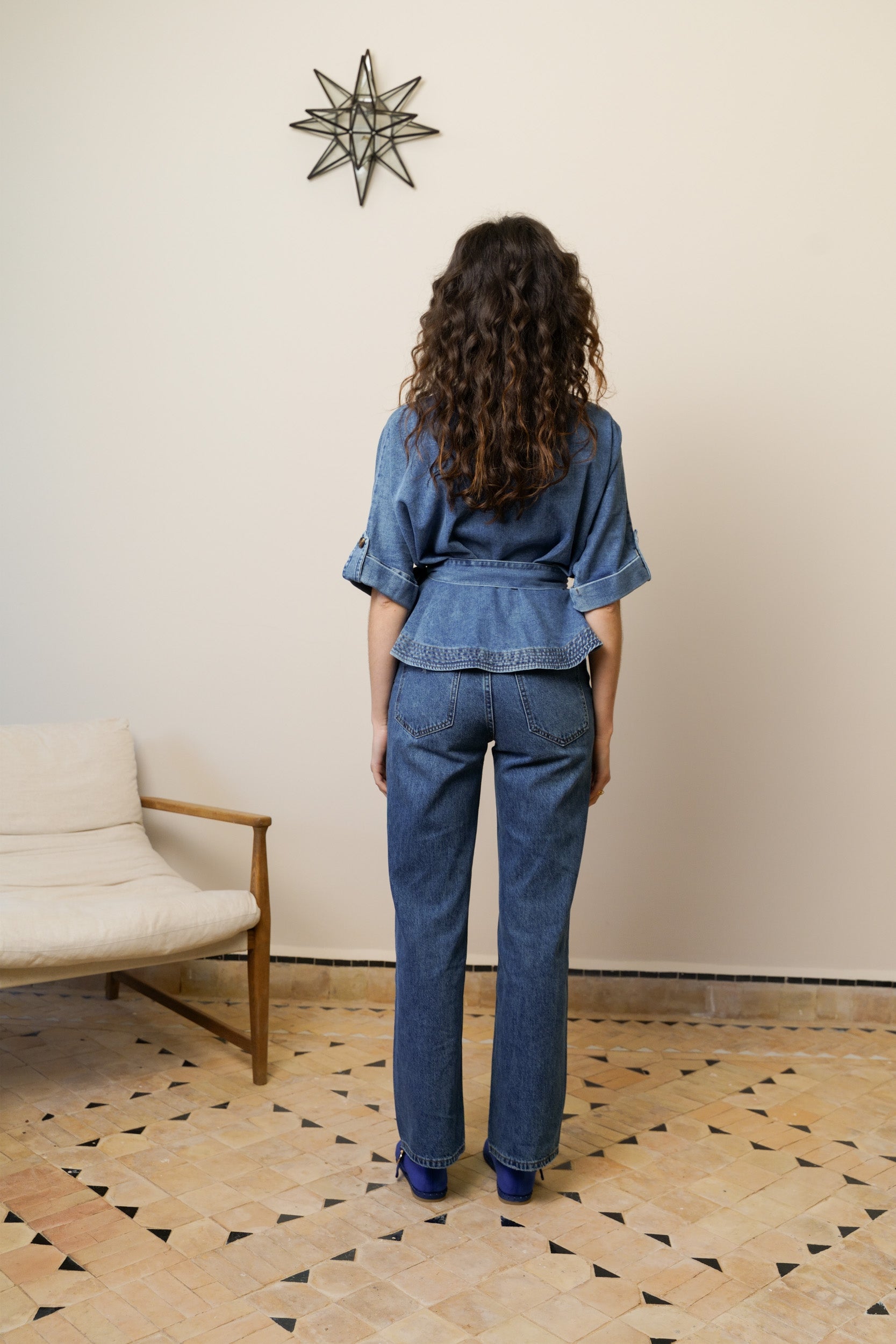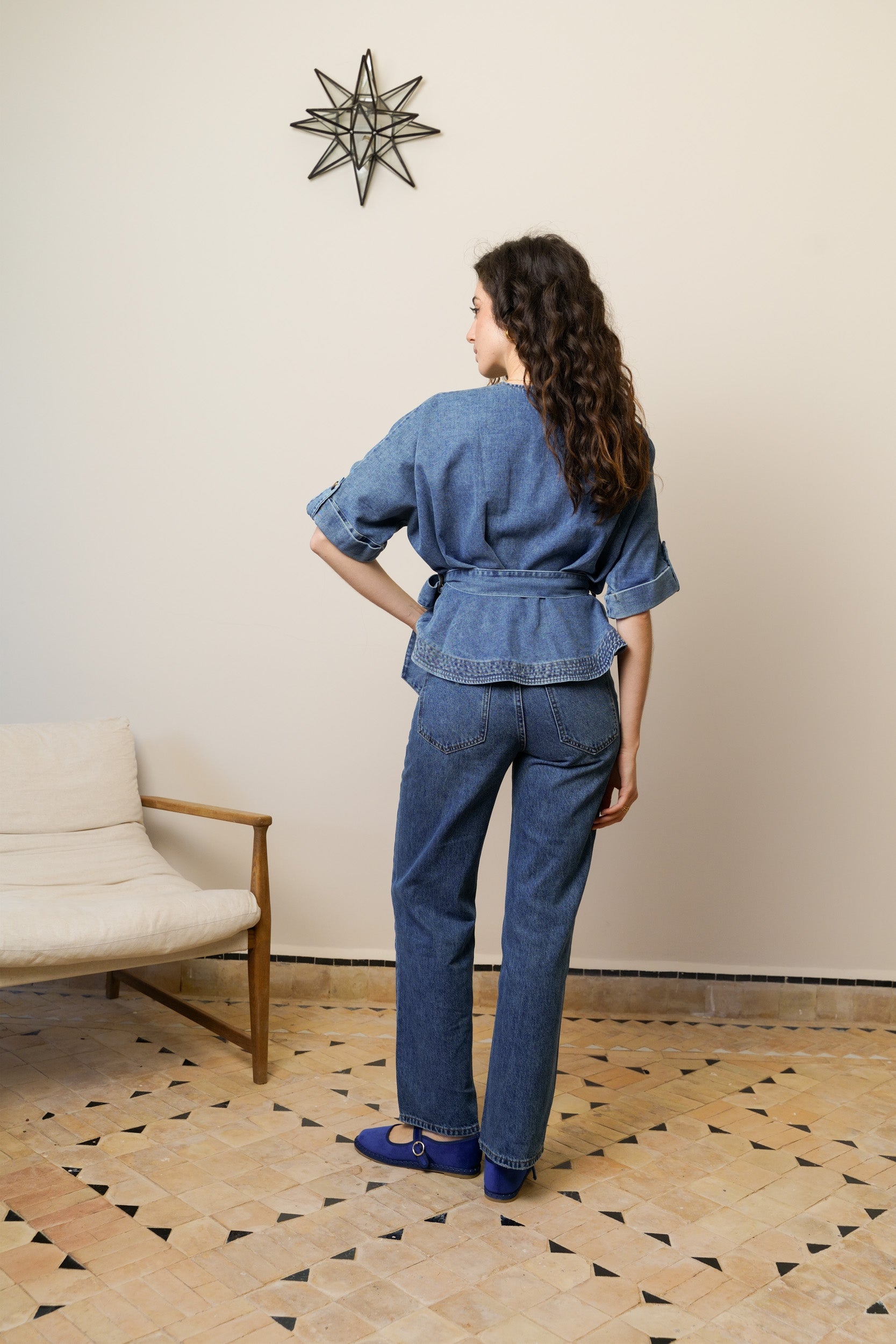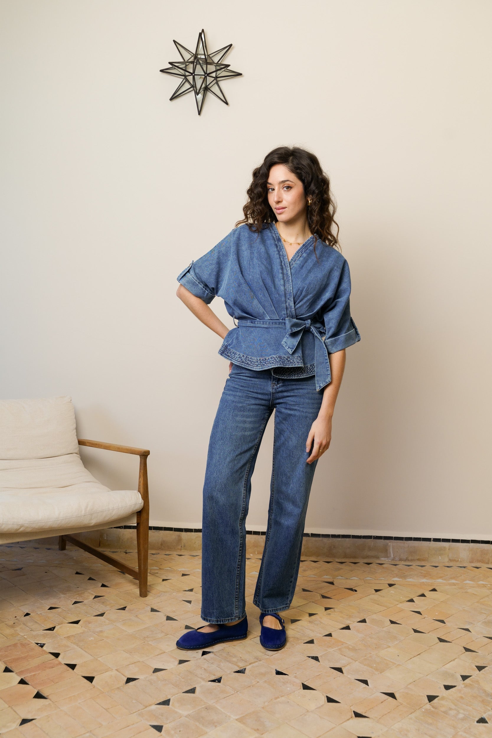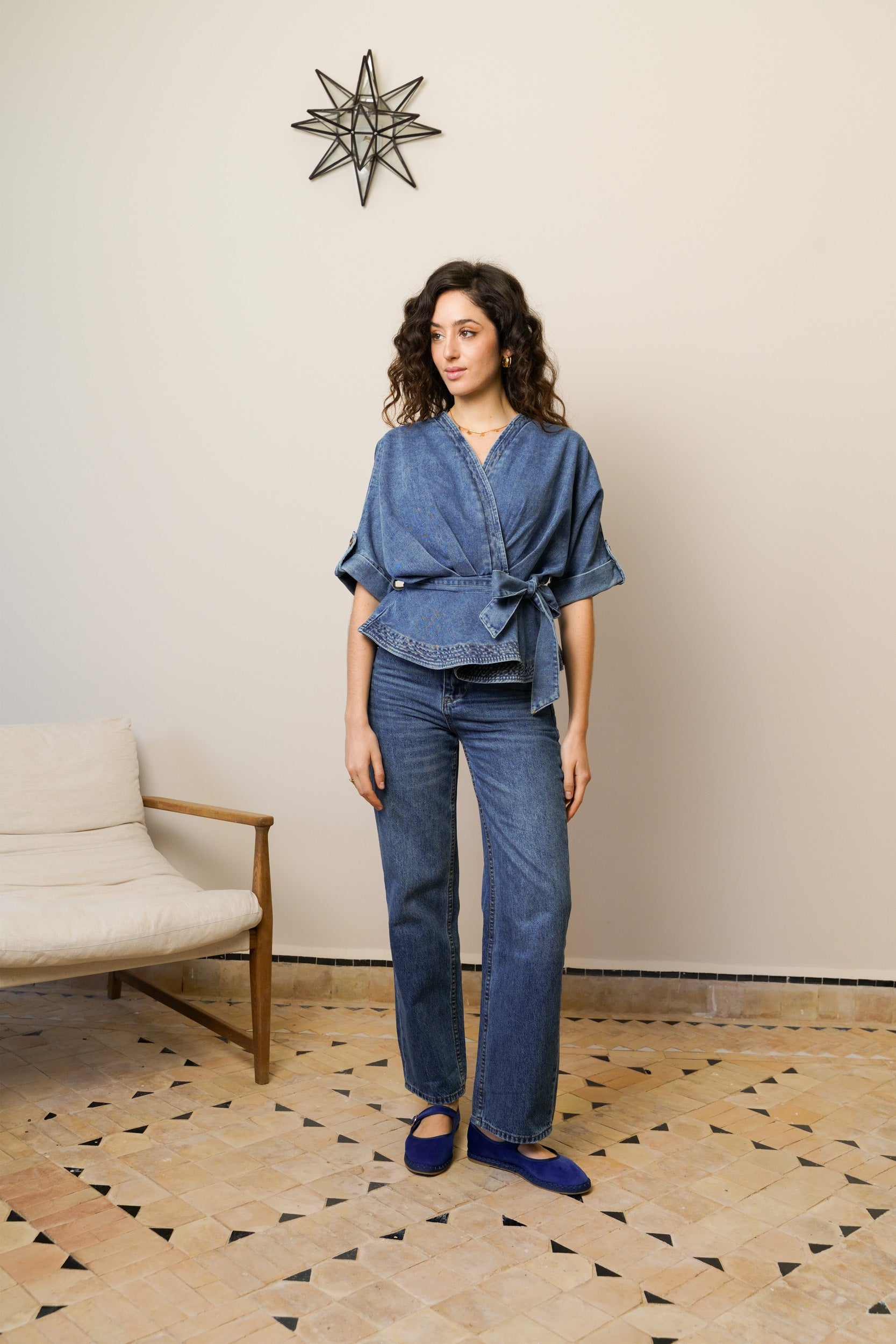 Sa coupe cache-cœur dessine joliment le décolleté et marque la taille grâce à son lien à nouer sur le côté. Le denim souple apporte de la tenue tout en restant confortable au quotidien. Les manches courtes avec patte boutonnée structurent la silhouette et ajoutent un détail soigné.