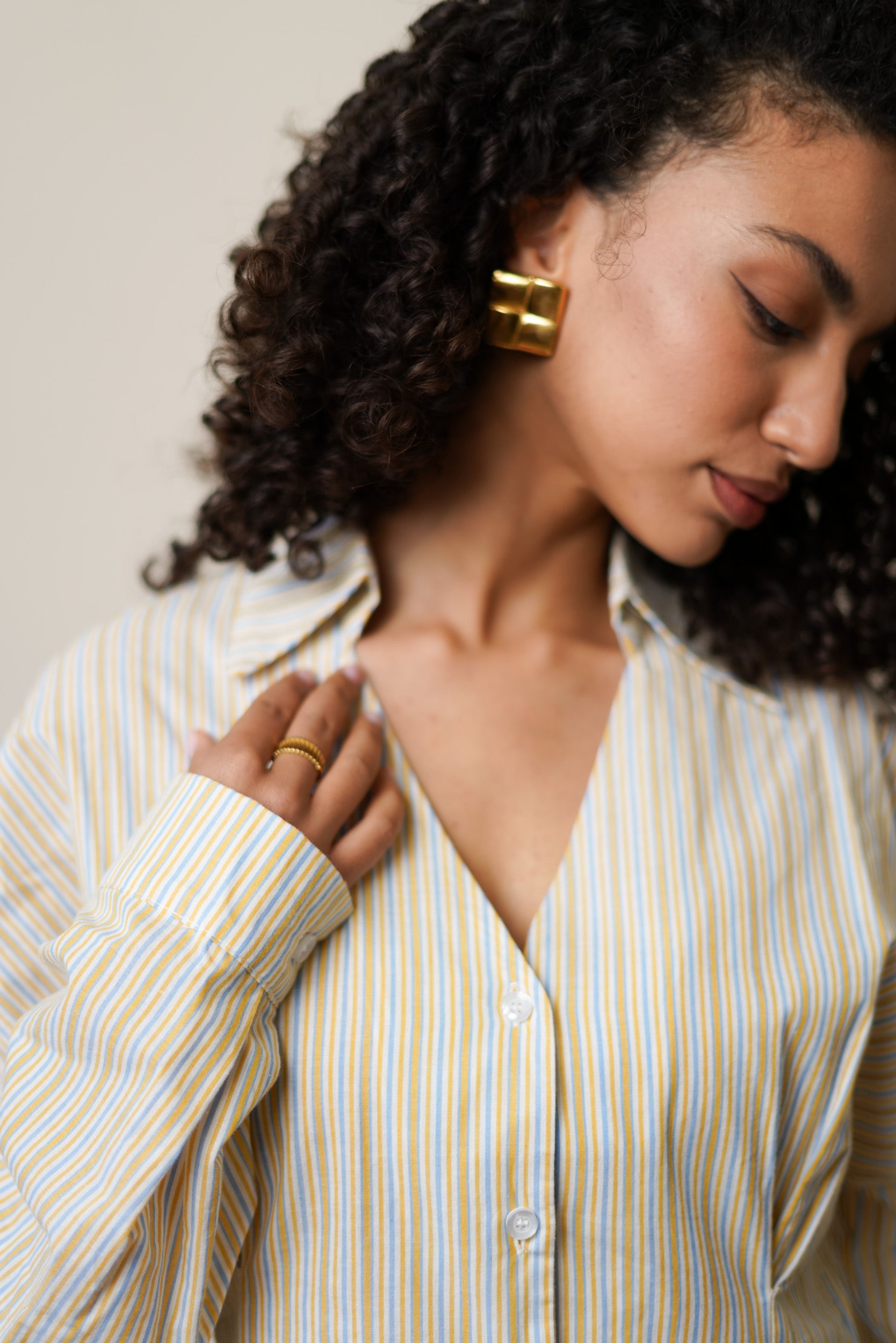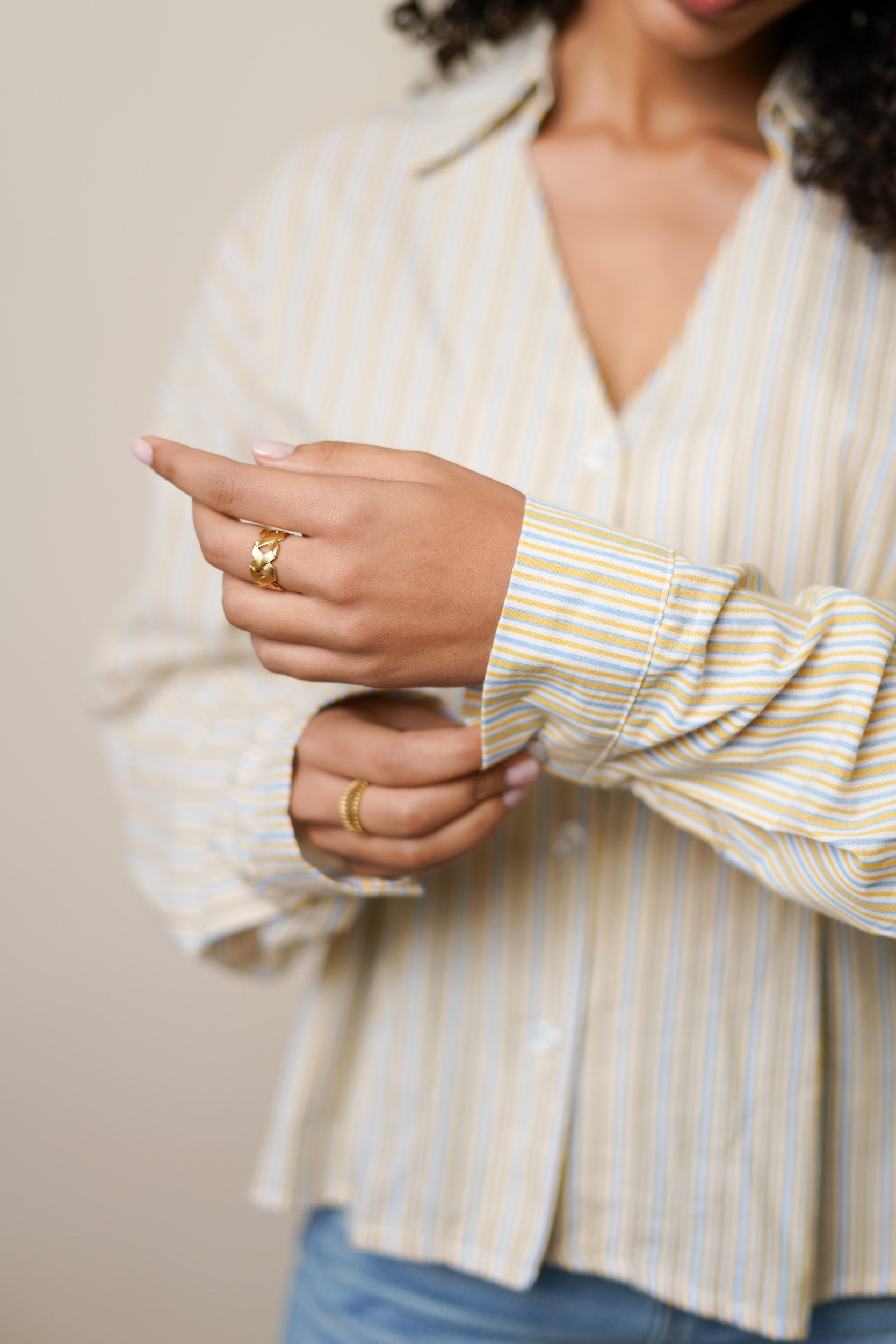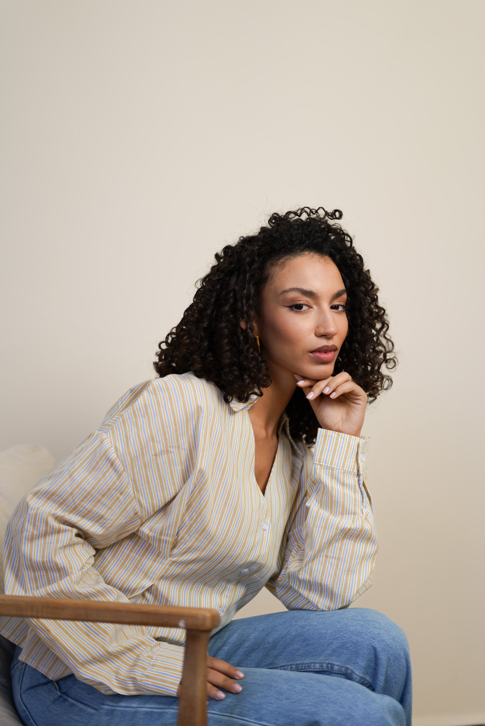 La chemise Floranne est confectionnée dans un tissu léger à rayures verticales. Ce chemisier présente une coupe droite légèrement évasée. Le col est classique avec une ouverture en V.