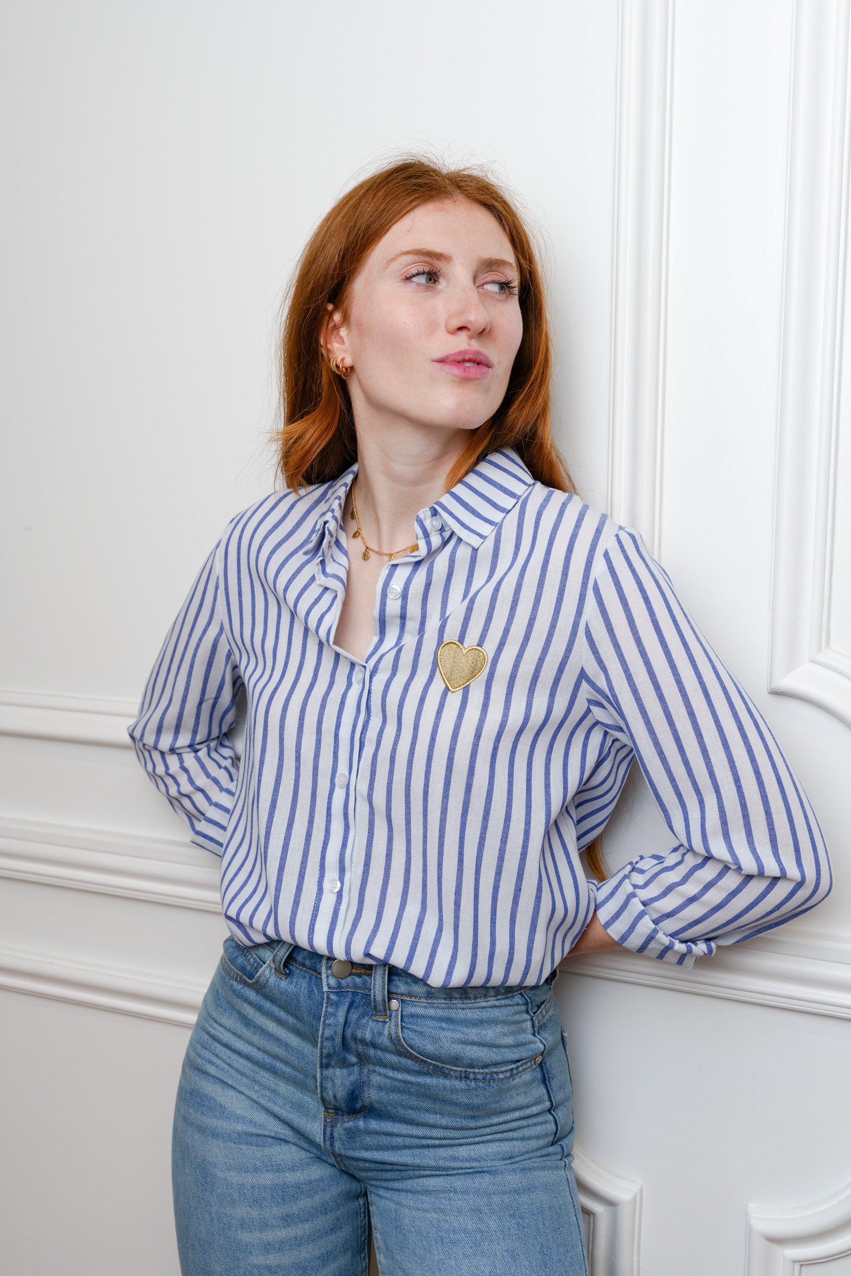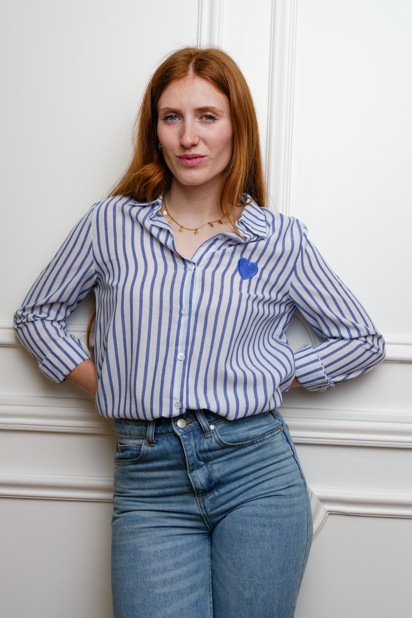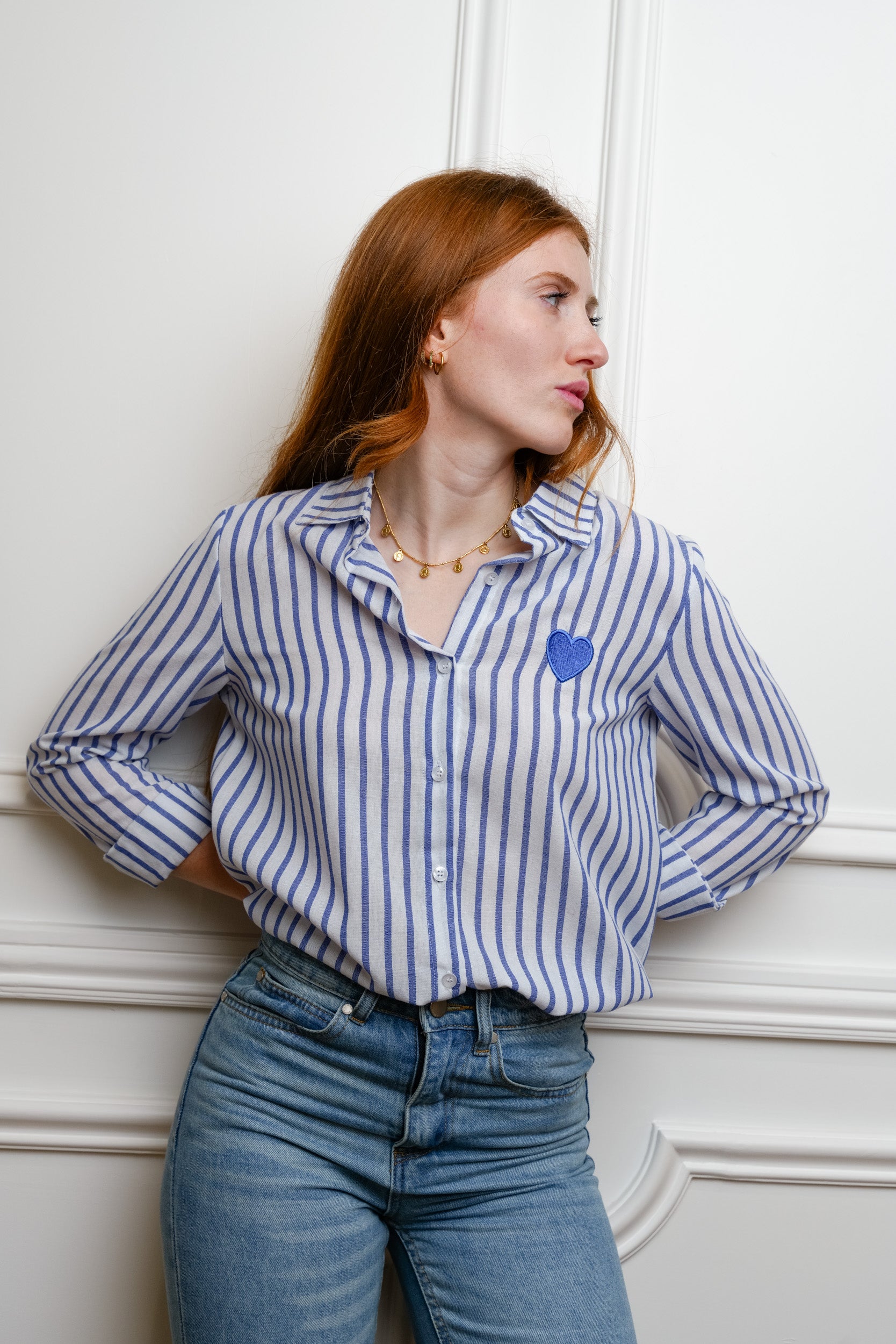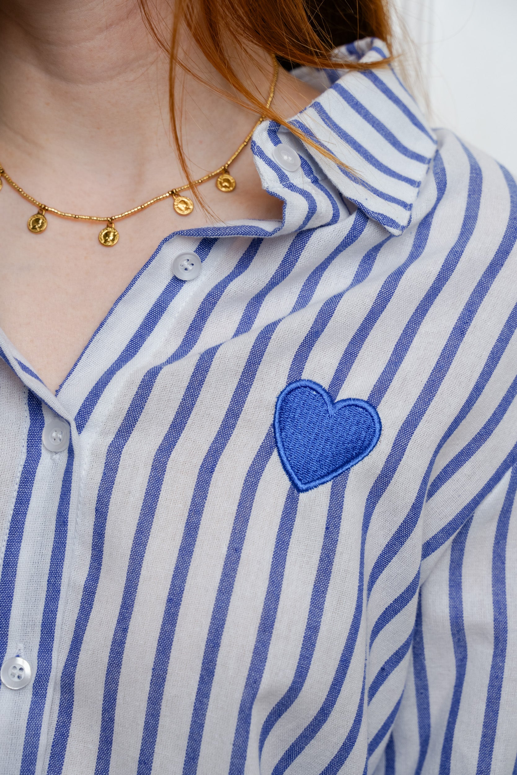 Cette chemise à rayures est une pièce facile à porter au quotidien. Son motif rayé est rehaussé d’un cœur brodé placé sur la poitrine, un détail discret qui apporte une touche féminine.