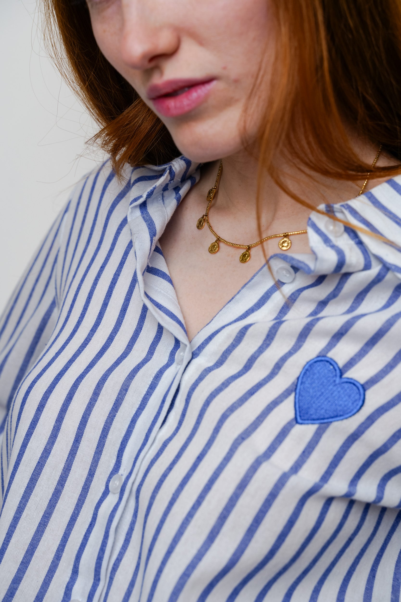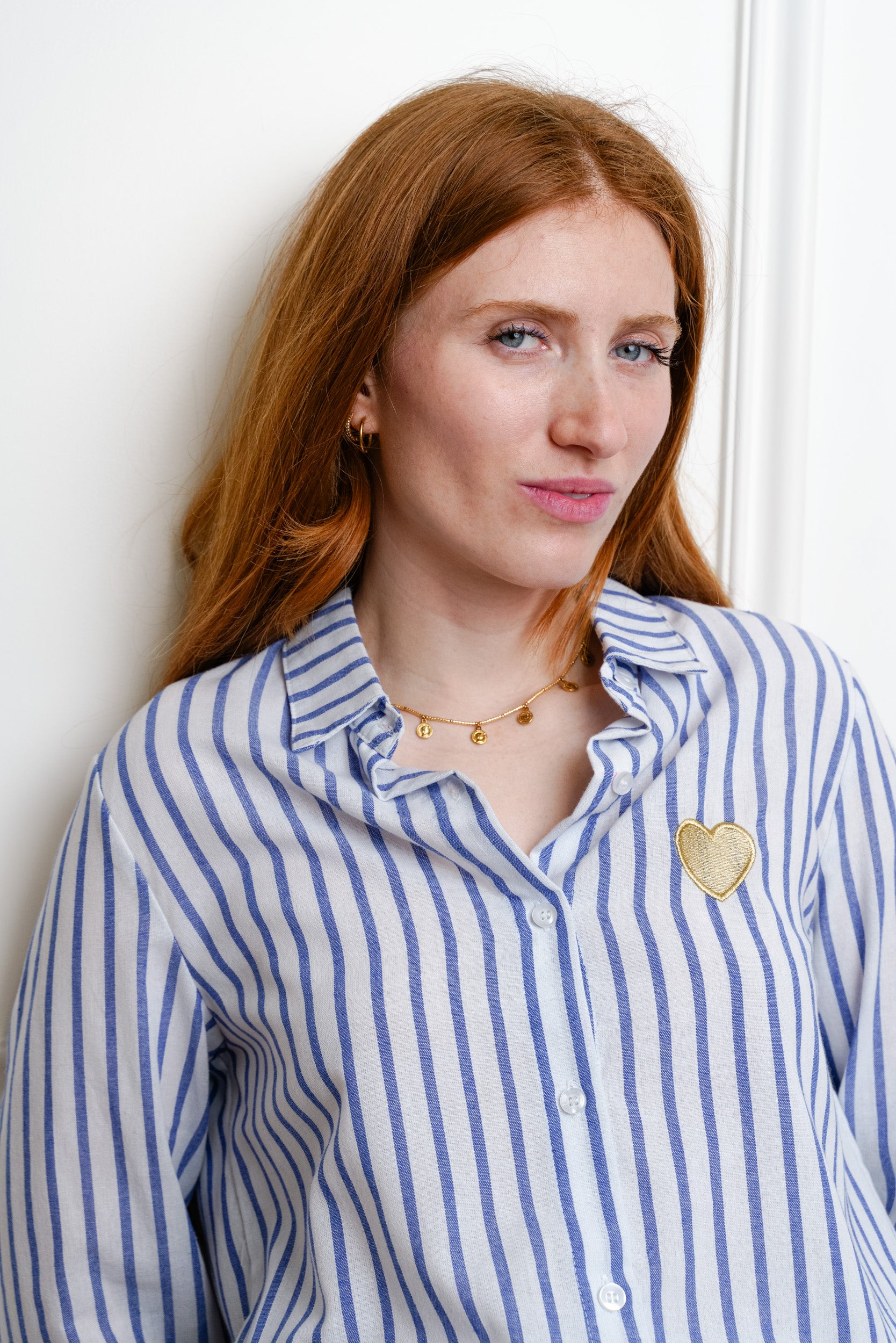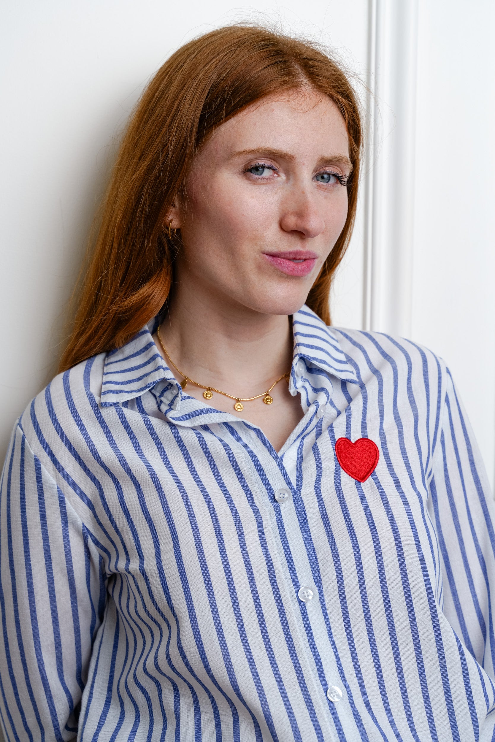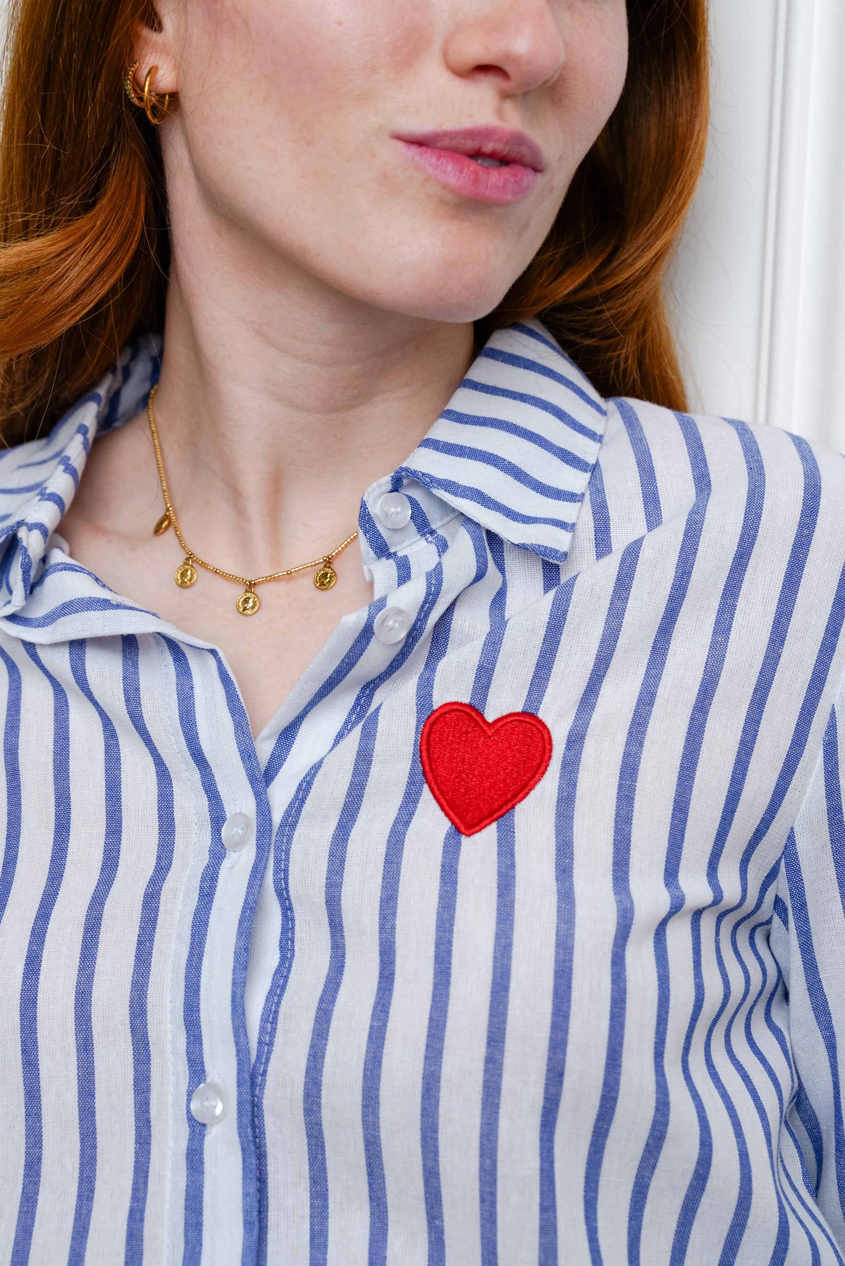 Cette chemise à rayures est une pièce facile à porter au quotidien. Son motif rayé est rehaussé d’un cœur brodé placé sur la poitrine, un détail discret qui apporte une touche féminine.