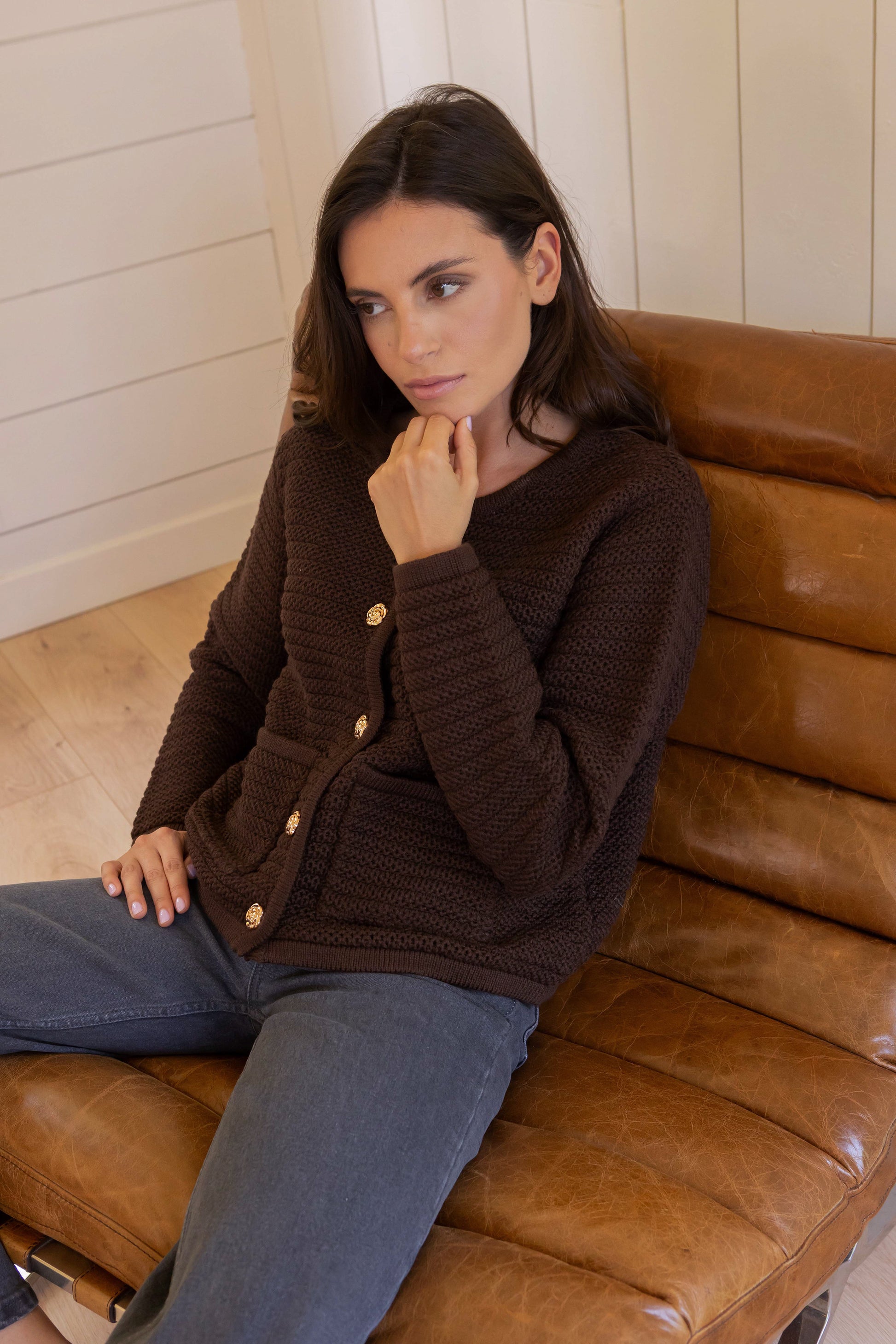 Notre gilet Blandine est un indispensable du vestiaire, avec sa teinte chocolat, ultra tendance cet automne, il rehausse toutes les carnations. Sa maille texturée et ses boutons dorés en forme de rose lui confèrent une allure à la fois élégante et rétro. Facile à associer, il apporte une touche raffinée à toutes vos tenues