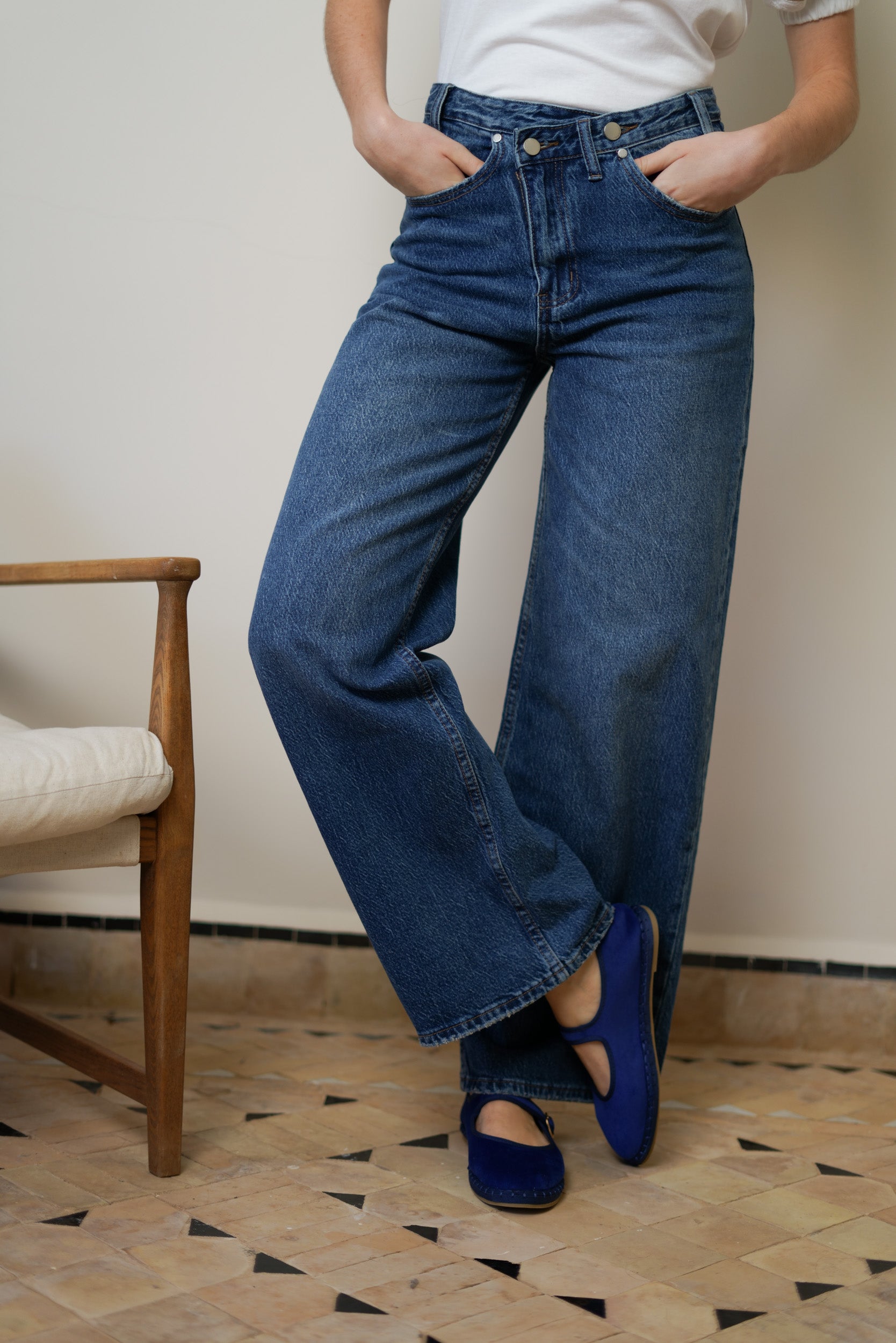 Un jean au détail qui change tout. Sa fermeture croisée à double bouton structure la taille et apporte une touche mode subtile. La taille haute galbe la silhouette tandis que la coupe droite et légèrement large allonge la jambe.