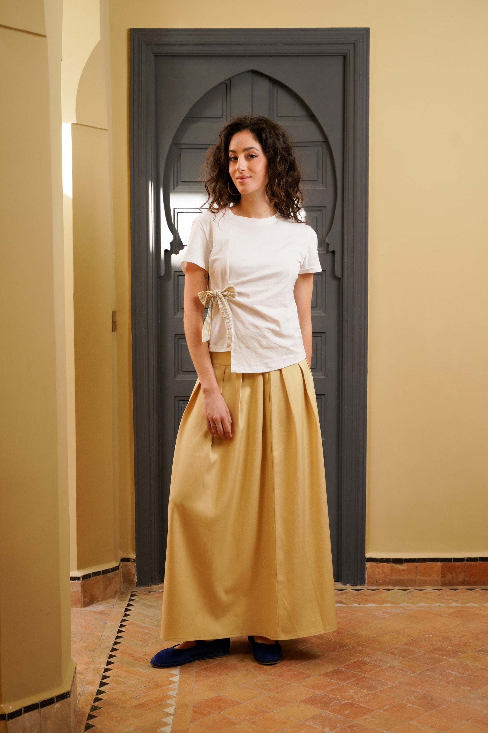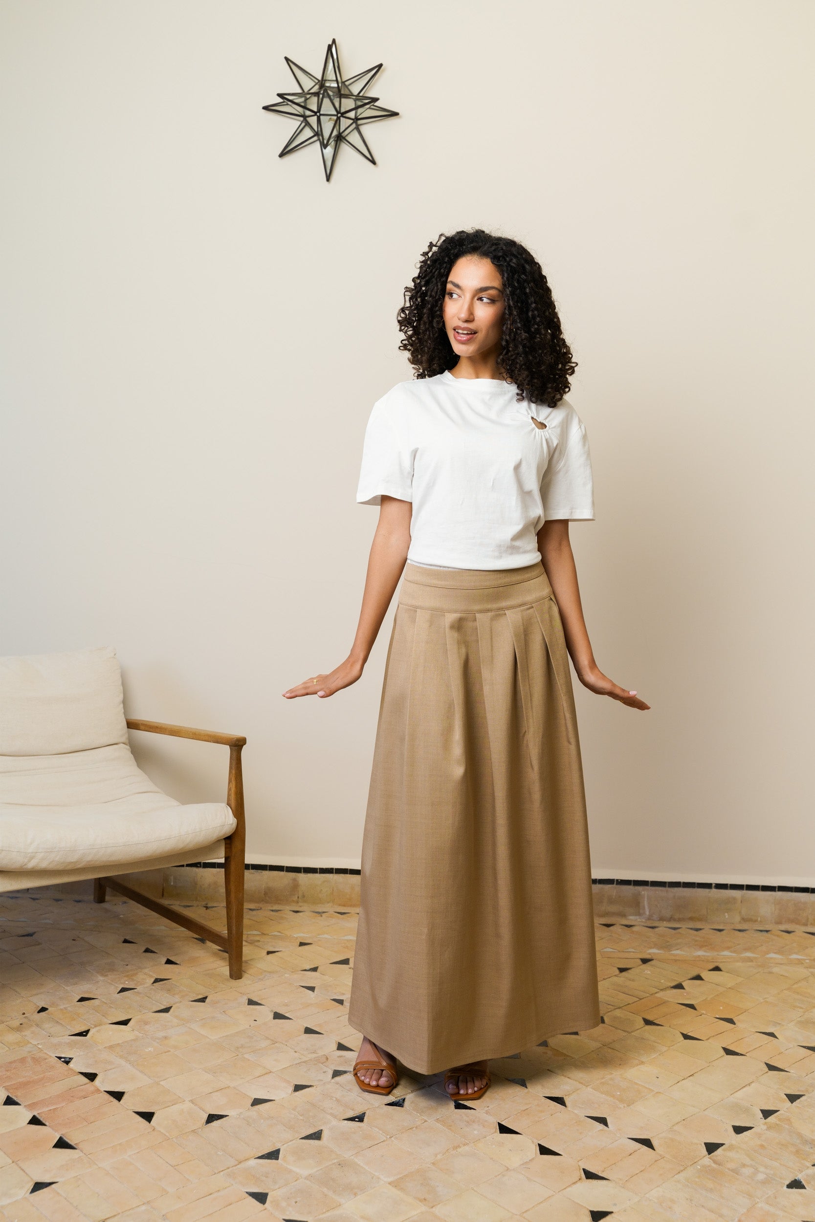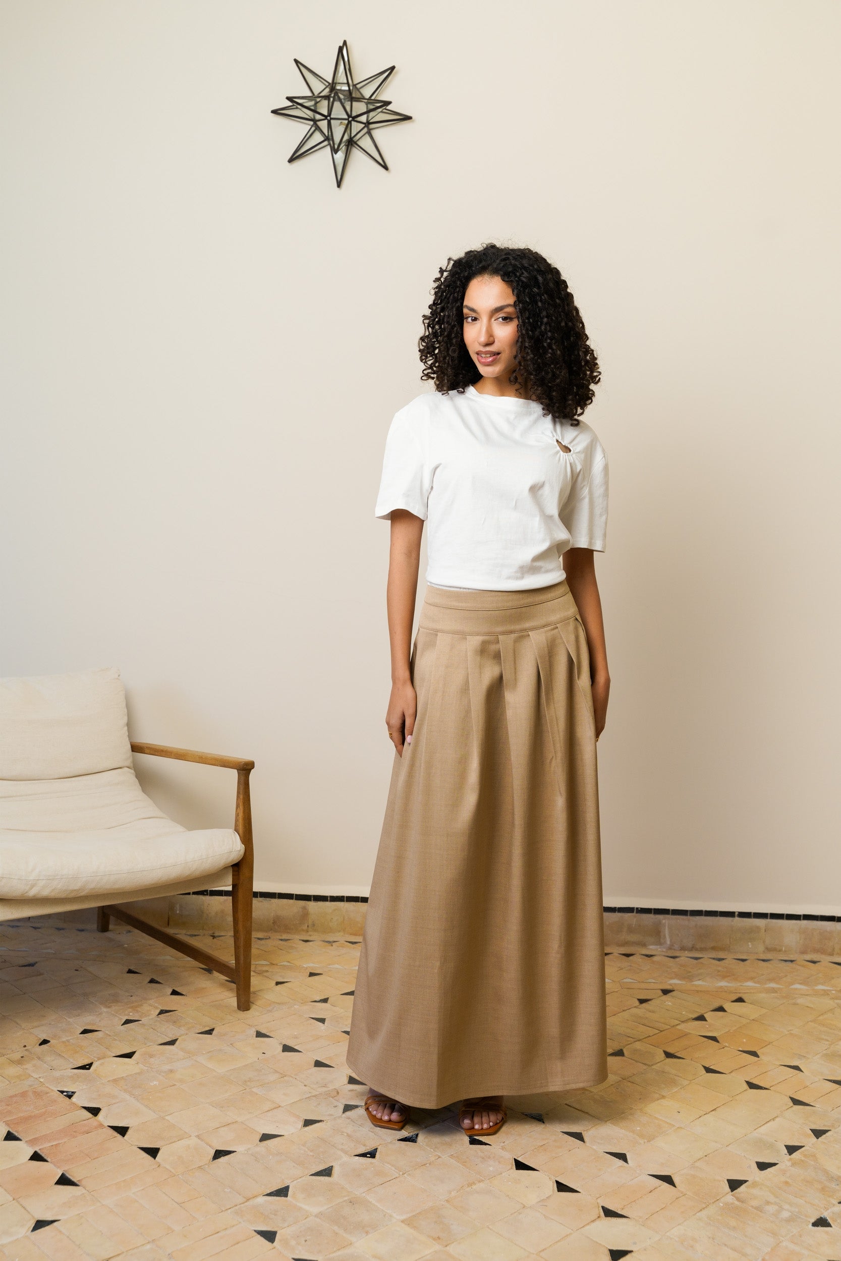 Cette jupe longue structure la silhouette tout en gardant un tombé naturel. Sa taille haute souligne la ligne et les plis plats apportent du volume maîtrisé. La matière, légèrement texturée, donne de la tenue sans rigidité. Elle accompagne les mouvements avec fluidité et s’adapte facilement.