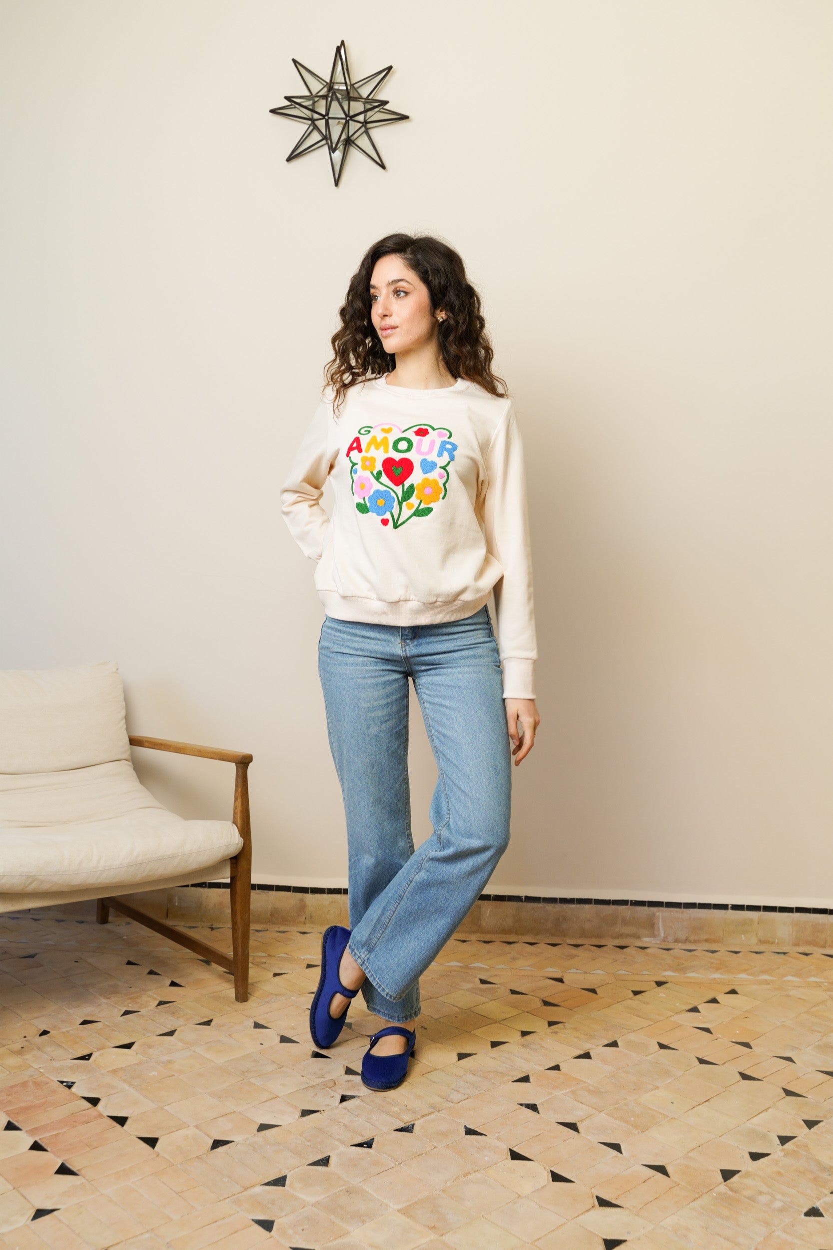 Son motif coloré “AMOUR” entouré de fleurs donne du relief et du caractère. La coupe droite et la matière confortable en font une pièce facile à porter toute la journée.