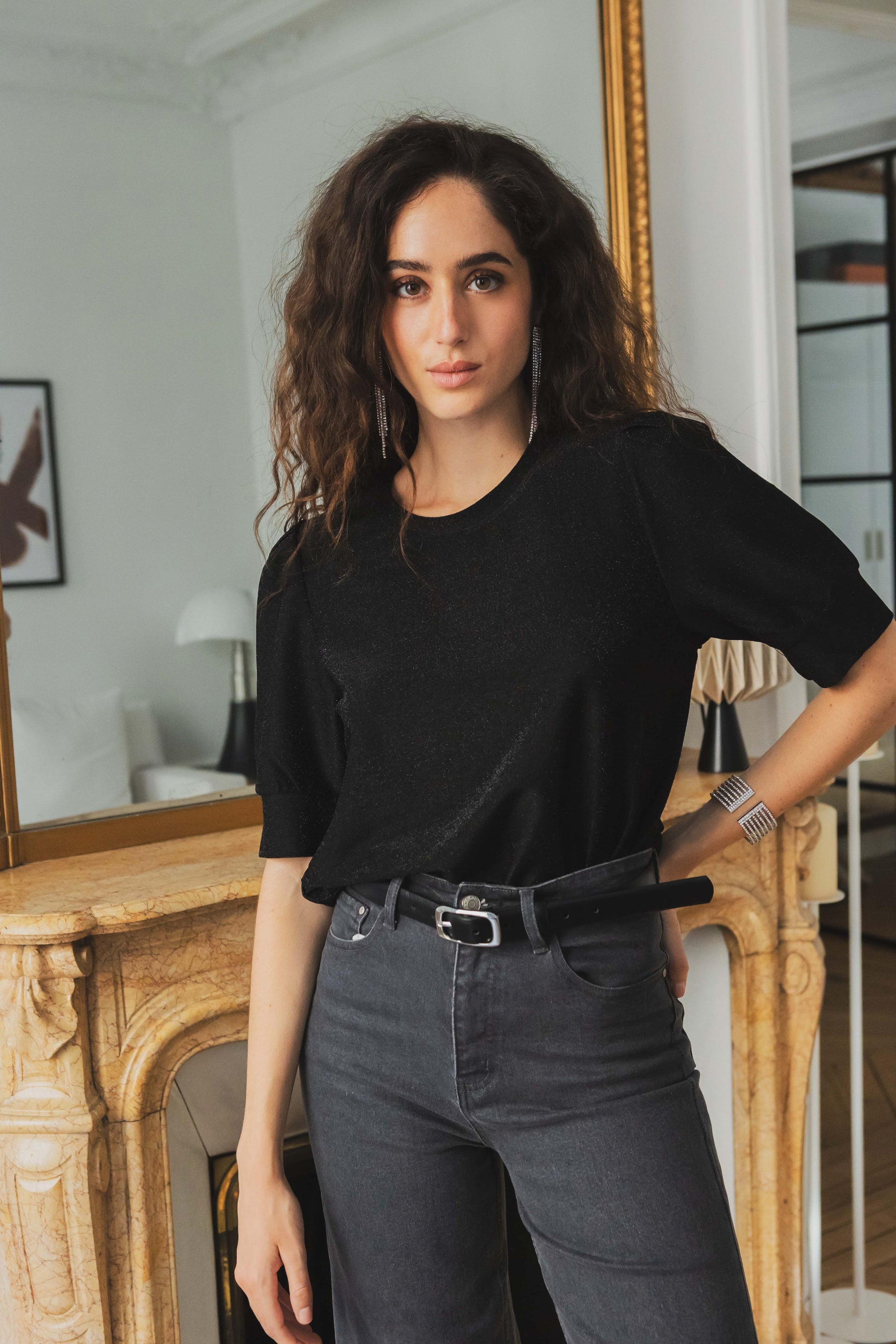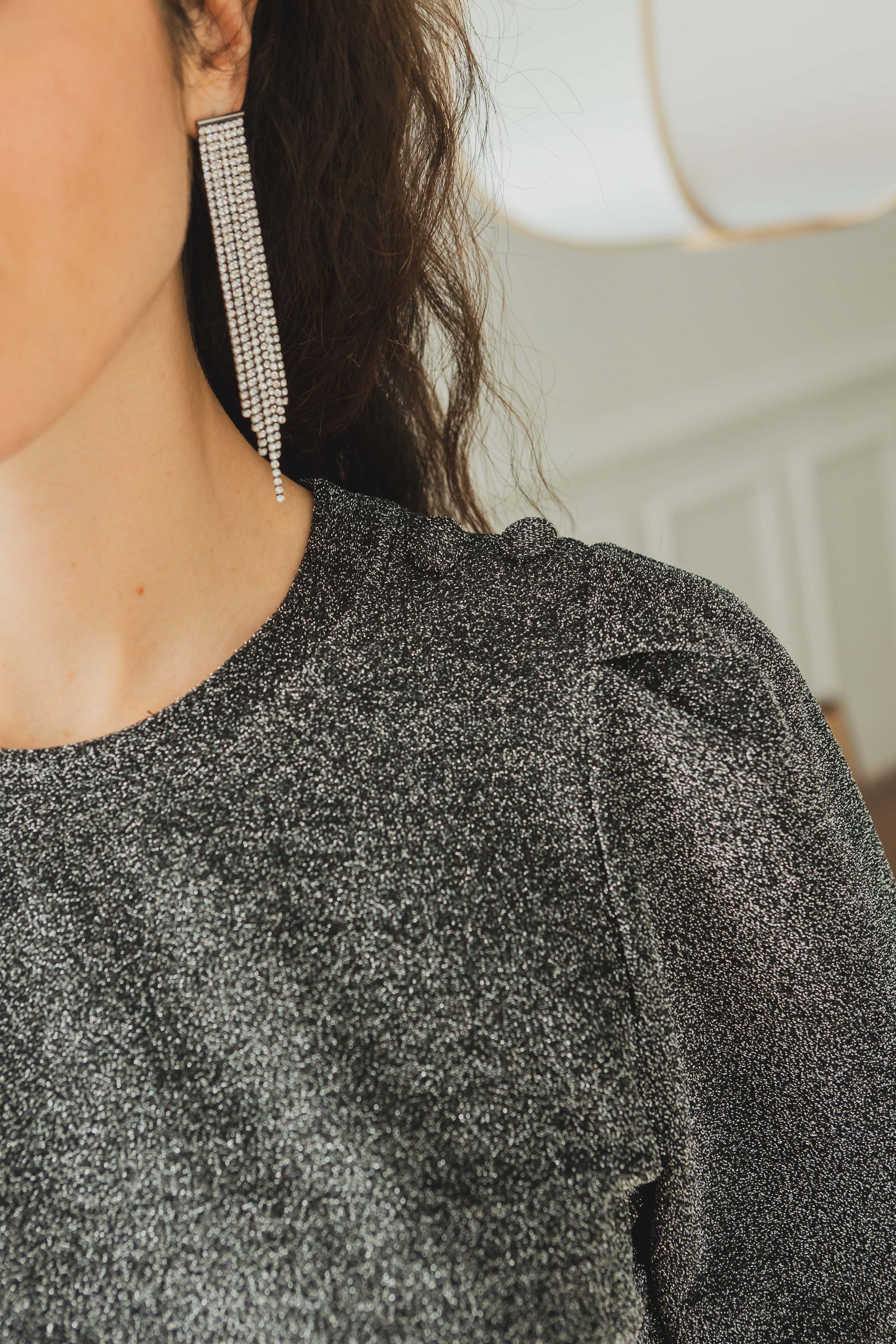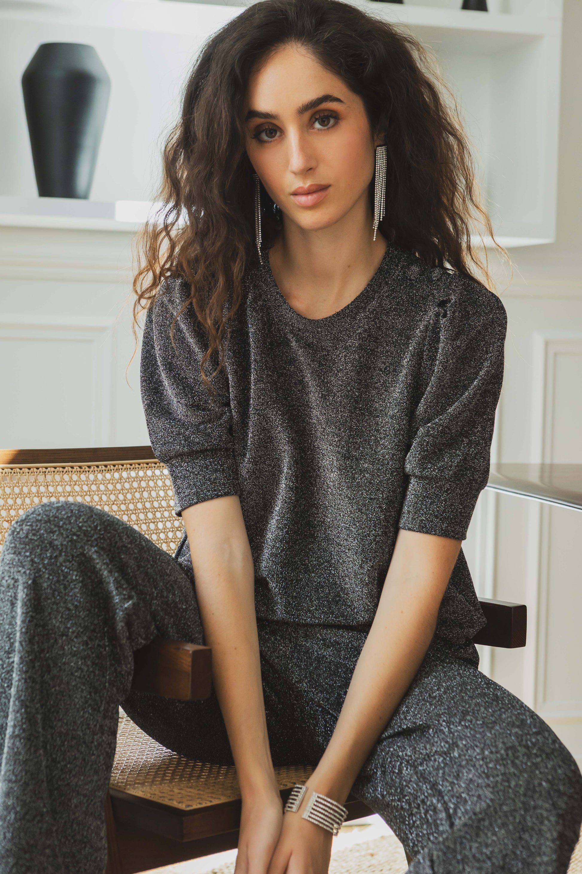 Un top pailleté facile à porter, idéal pour les fêtes ou pour illuminer vos looks du quotidien. Sa matière fluide et brillante se marie aussi bien avec le pantalon Lucie pour un total look scintillant qu’avec un jean brut pour un style plus décontracté.
